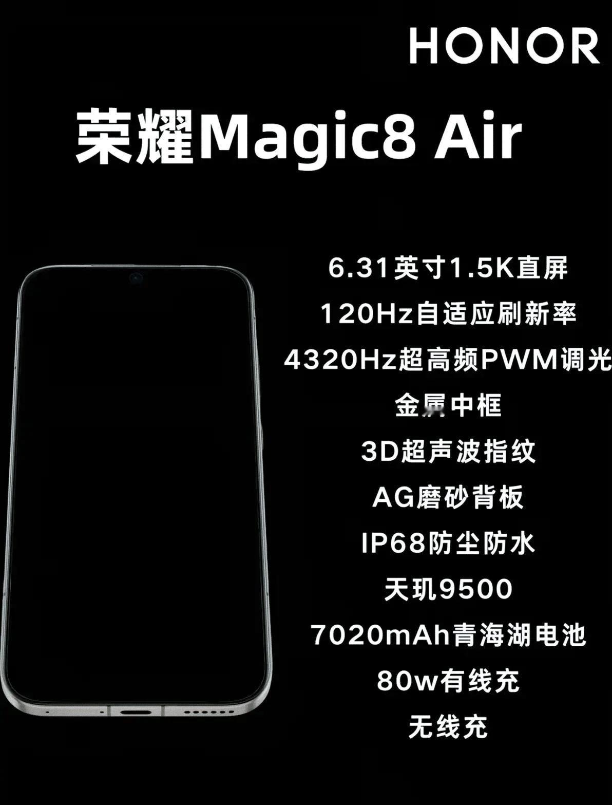 荣耀直接掀桌子算了,新机像下饺子一样,友商估计心都凉了一半,荣耀500,Win系,power2,现在Magic8 Air系又来了一个王炸,这哪是碾压,完全是不留活路,而且猪队友也是忍不了一点,配置全给发出来了。 1.5k+120hz的6.31寸旗舰小屏,搭载天玑9500,金属中框质感,3d超声波,更逆天的7开头的电池,真是大开眼界,目前的air手机中,说是称第二,没人敢称第一,怎么说呢,荣耀Air做长续航+旗舰拍照+小屏质感,我有强烈的预感,又是爆 杀的一台手机了,而且从方飞总的发文,还有一个pro版air。当然没发布前,就当是参考,一切以官方发布为准。