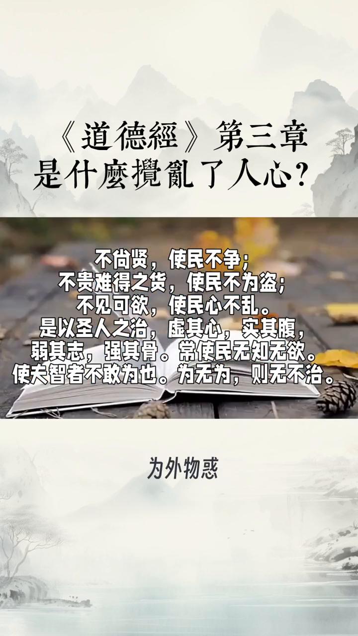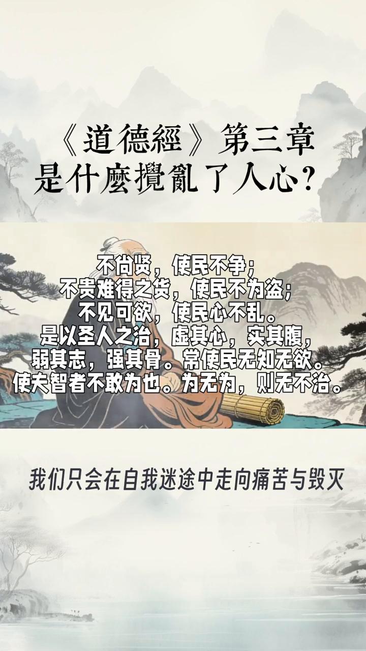 《道德经》第三章是什么搅乱了人心? 悟道箴言:不尚贤,使民不争;不贵难得之货,使民不为盗;不见可欲,使民心不乱。是以圣人之治,虚其心,实其腹,弱其志,强其骨。常使民无知无欲,使夫智者不敢为也。为无为,则无不治。 释意:不崇尚贤才异能,使人民不至于炫技逞能而争名逐利;不看重稀贵之物,使人民不做盗贼;不显露足以引起贪欲的物事,使人民的心思不至于被扰乱。 因此,圣人治理天下的原则是:清理充斥于人民心中的各种欲念,满足人民的温饱需求,软化人民的外部攀比,提高人民的自立自足能力,使人民经常保持不执成见,不生贪欲的状态,也让那些所谓的"智者"不敢为所欲为。按照大道的规律去做,不刻意以人为的方式做事,即可以实现全面的治理。 总结一下本章中老子的智慧思想,可以发现现实中正在做的很多事正是老子所反对的。由此看来,若是没有圣人的智慧引领,只会在自我迷途中走向痛苦与毁灭。 说到底,人的一切问题就是内部和外部谁决定谁的问题。在现实的层面,如果被外部事物决定了,人生就变成风雨中飘摇的落叶。在理想的层面,如果知道一切被大道规律决定着,信道皈道行道,人生就可过得逍遥。 若是不注重自己的修行,希望外部的"神灵"能够保佑自己的平安和幸福,心灵就走上了歪道。因为所谓的"神灵"就是还没领悟的客观大道,那种制约一切的客观规律。如能修行觉悟,与道同在,即是与"神"同在,这才是智慧和圆满的人生。 悟道真言:随外勿动,自心即成为奴隶;为外物惑,生命即成为木偶。与别人比,顷刻间失去平衡。极度强者必减损个人智慧;鄙视弱者,必亏损个人品性。自以为是,乱人乱己生罪过。专注自心,明道自强省烦恼。人生三维联动一样不能少。若不觉悟瞎忙乱动过不好。