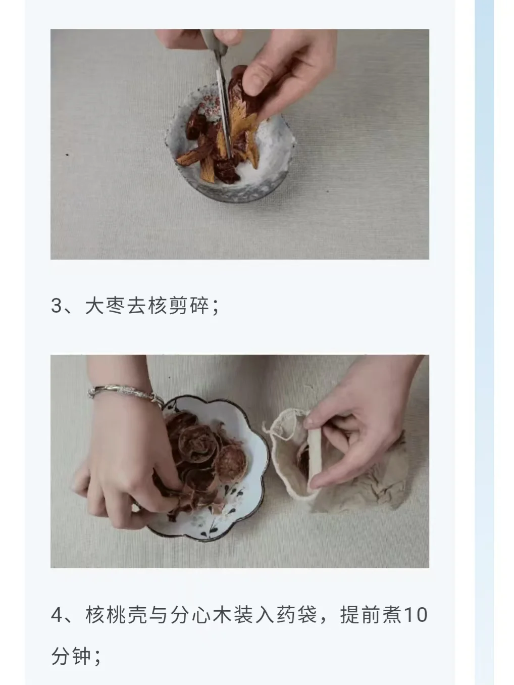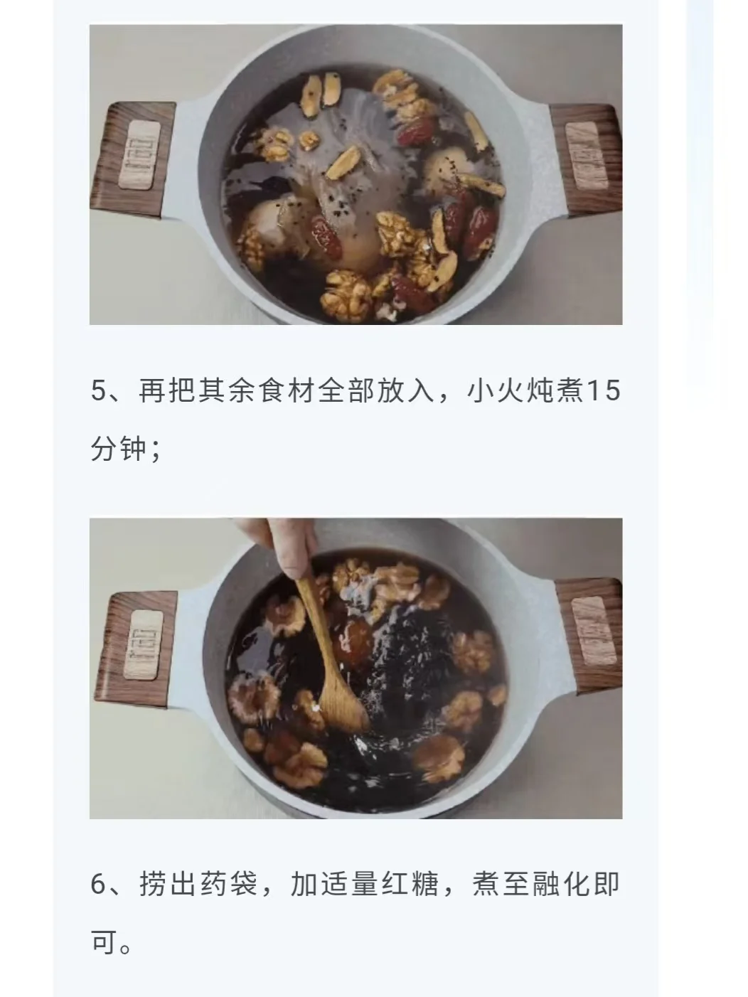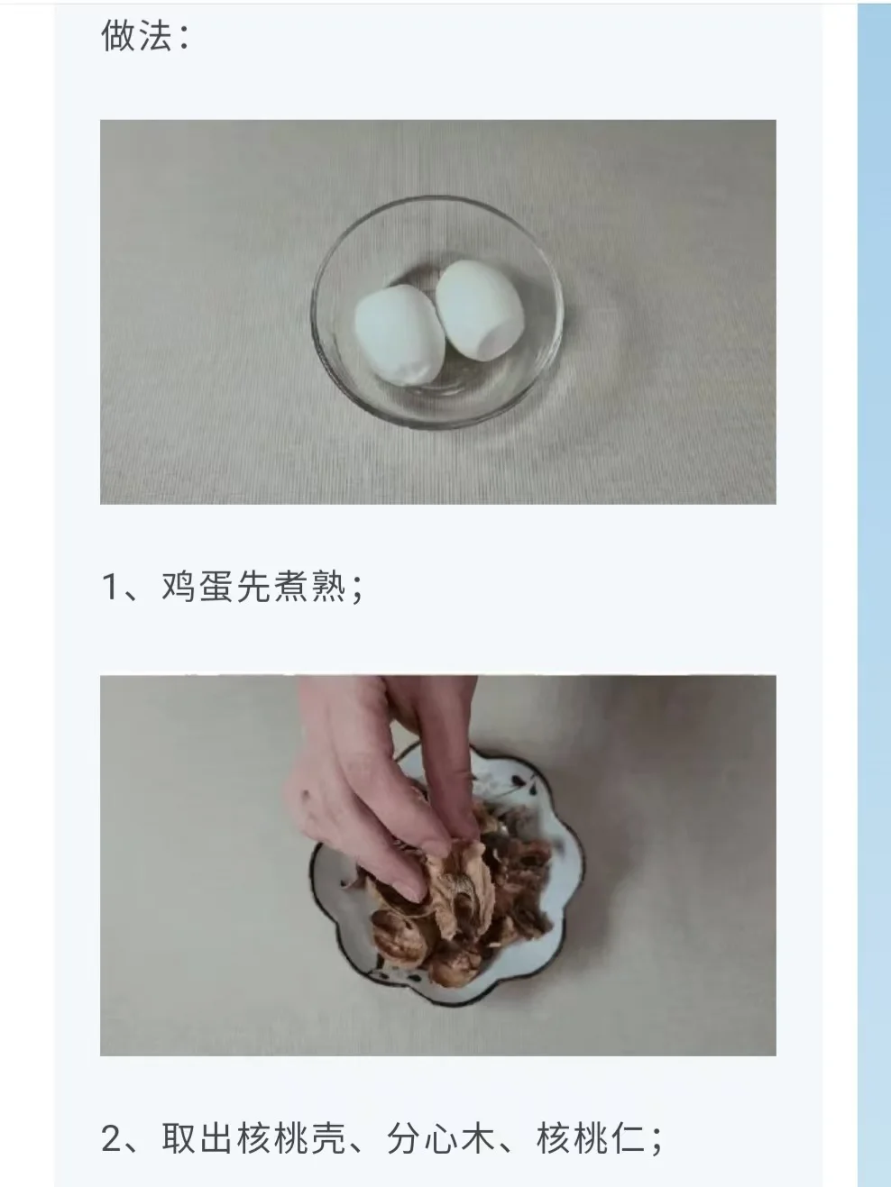 [清单R]原料:核桃6个、鸡蛋2个、黑芝麻3克、大枣3枚、红糖适量