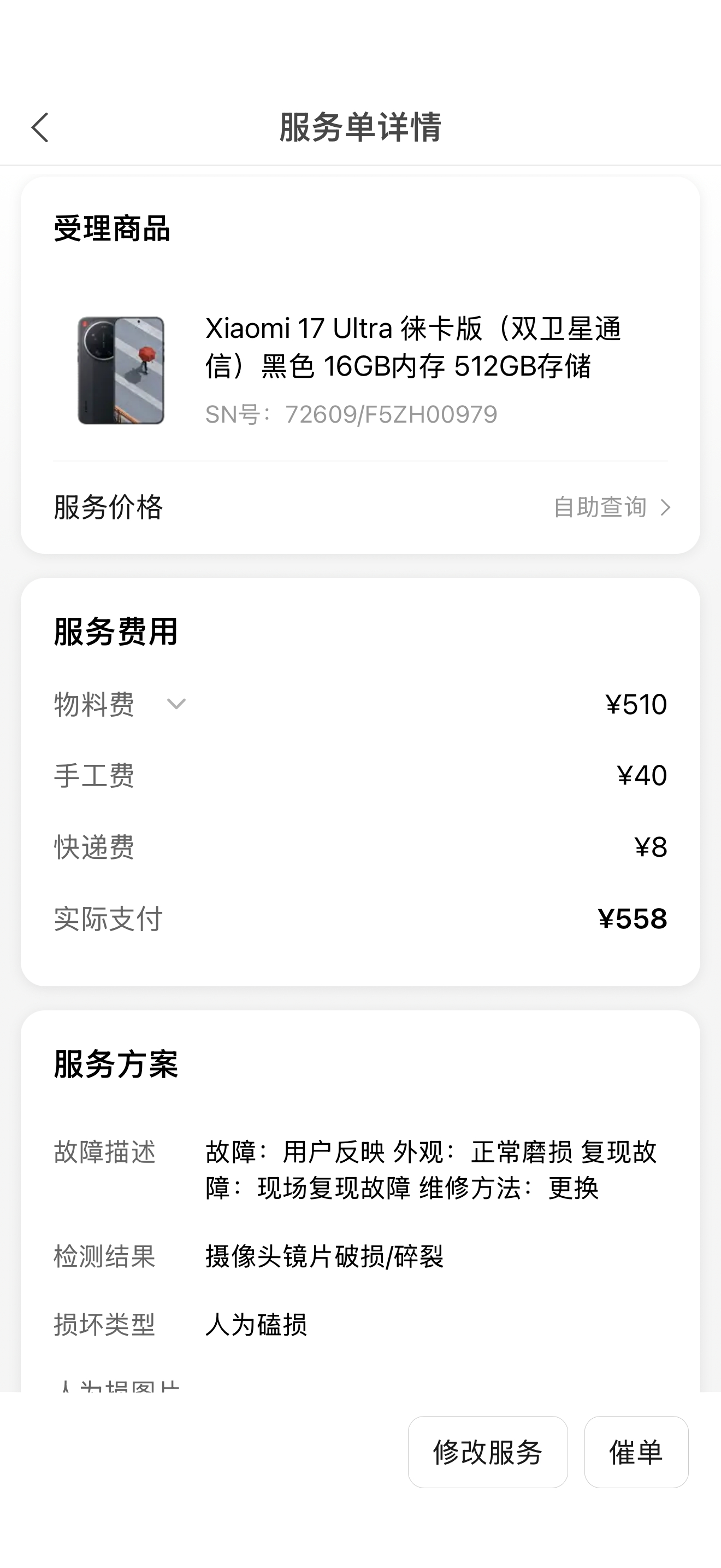 小米17Ultra徕卡版的后盖寄过去修了、加上手工费一共558元、售后处理的挺快的、今天就修好了、补充一下非徕卡版的后盖费用是330元(配件)、徕卡版是510元、所以变焦环后盖要贵180元