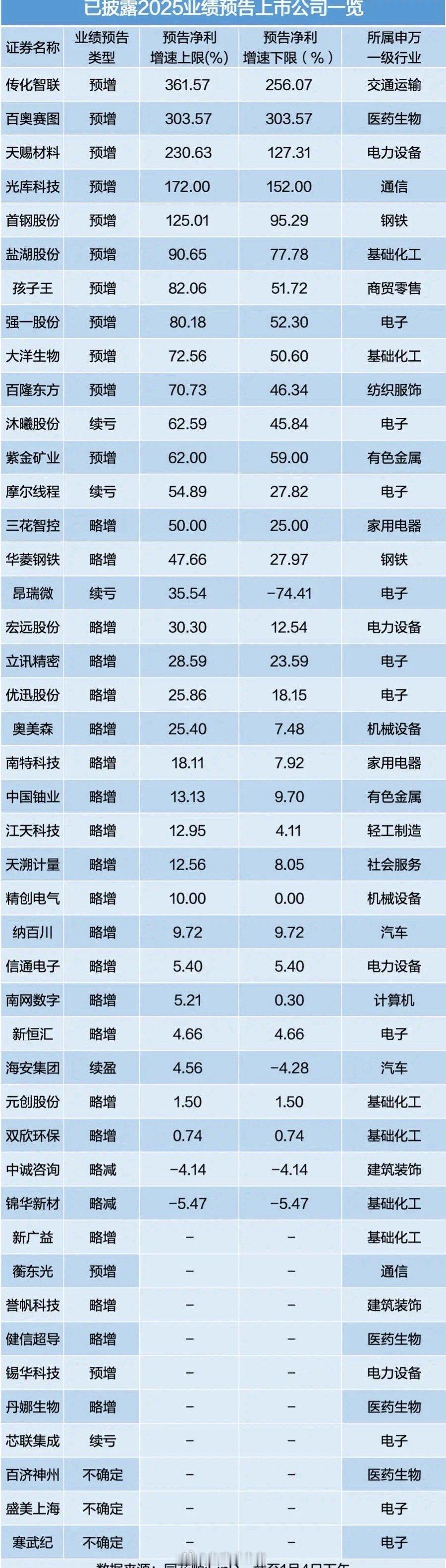 近八成预喜!44家A股业绩预告亮点纷呈,最高增幅超360%随着2025年年报披露窗口临近,A股业绩预告密集落地。据同花顺iFinD数据统计,截至1月4日下午,已有44家A股上市公司披露年度业绩预告,其中35家实现业绩预喜(含预增、略增、扭亏、续盈),占比高达近八成,多个行业龙头与高景气赛道企业交出亮眼答卷。龙头稳健托底,细分领域藏“预增王”行业龙头企业凭借稳固基本面持续领跑,增长韧性凸显。消费电子龙头立讯精密(002475.SZ)预计归母净利润165.18亿元至171.86亿元,同比增长23.59%至28.59%,AI技术融合与全球化战略成为核心驱动力;热管理领域标杆三花智控(002050.SZ)净利润预计增长25%至50%,新能源汽车热管理业务的领先布局持续贡献增长动能;矿业巨头紫金矿业(601899.SH)受益于矿产品产量提升与价格上涨,净利润增幅预计达59%至62%,预计归母净利润超500亿元。最引人注目的是“预增王”传化智联(002010.SZ),其归母净利润预计达5.4亿元至7亿元,同比增幅高达256.07%至361.57%,主营业务增长叠加股权运作带来的投资收益成为业绩爆发的双重引擎。传统制造逆势突围,高景气赛道批量报喜传统制造业在本轮业绩预告中表现亮眼,钢铁行业尤为突出。首钢股份(000959.SZ)预计归母净利润9.2亿元至10.6亿元,同比增长95.29%至125.01%,产品高端化与低成本管理理念成效显著;华菱钢铁(000932.SZ)在消化6.57亿元环保税补缴压力后,仍实现27.97%至47.66%的净利润增长,“四化转型”与降本增效筑牢盈利韧性。电子、医药生物等高景气赛道呈现批量报喜态势。电子行业的强一股份(688809.SH)净利润预计增长52.30%至80.18%,AI与半导体景气度持续拉动行业增长;医药领域的百奥赛图(688796.SH)凭借海外市场开拓与国内研发需求释放,净利润同比激增约303.57%,成为创新药赛道的亮眼代表。科技赛道分化,盈利预期与成长阵痛并存科技板块呈现明显分化态势。寒武纪(688256.SH)虽标注业绩“不确定”,但披露50亿元至70亿元的营业收入区间,19家机构一致预测其归母净利润约22.13亿元,市场对其盈利转正抱有强烈期待。不过,部分战略投入期的科技公司仍面临亏损压力。GPU芯片企业沐曦股份(688802.SH)预计归母净利润为-7.63亿元至-5.27亿元,摩尔线程(688795.SH)预计续亏-11.68亿元至-7.3亿元,但两家公司均表示,受益于人工智能与国产化进程加速,营业收入快速增长,亏损规模已显著收窄,成长潜力逐步显现。
