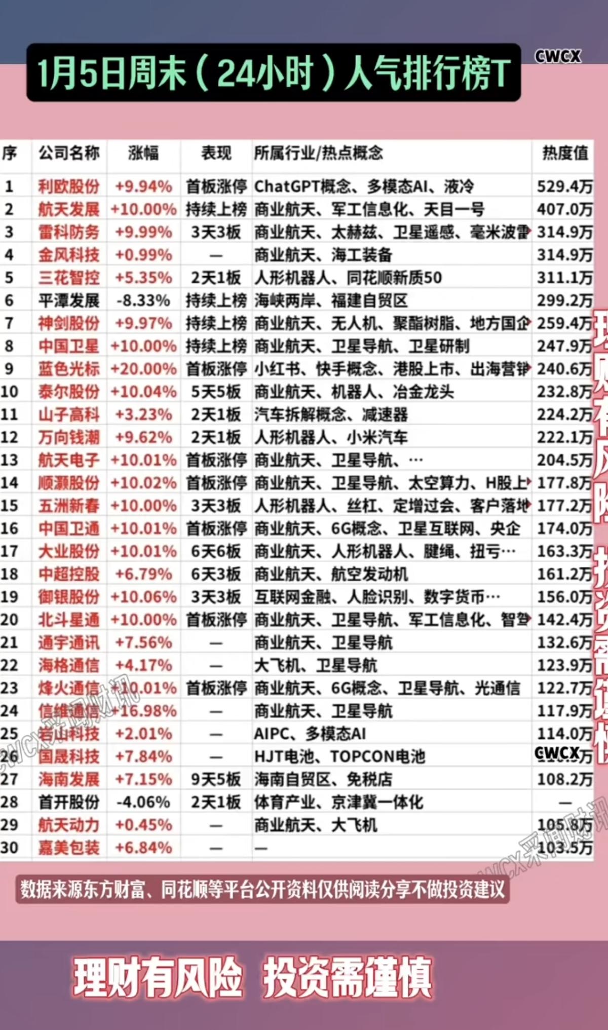 1.5周一(24h)人气热搜排行榜! 1.商业航天+军工信息化 2.卫星通信,无人机 3.人形机器人,减速器 4.数字货币,人脸识别 5.光通信,6G