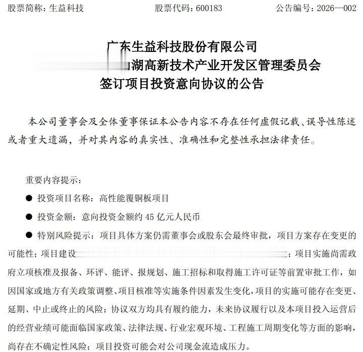 1月4日晚间,覆铜板行业龙头生益科技发布公告称,公司与东莞松山湖高新技术产业开发区管理委员会签订项目投资意向协议,意向投资金额约45亿元,投资于高性能覆铜板项目。该项目投资不属于关联交易,也不构成相关规定的重大资产重组。