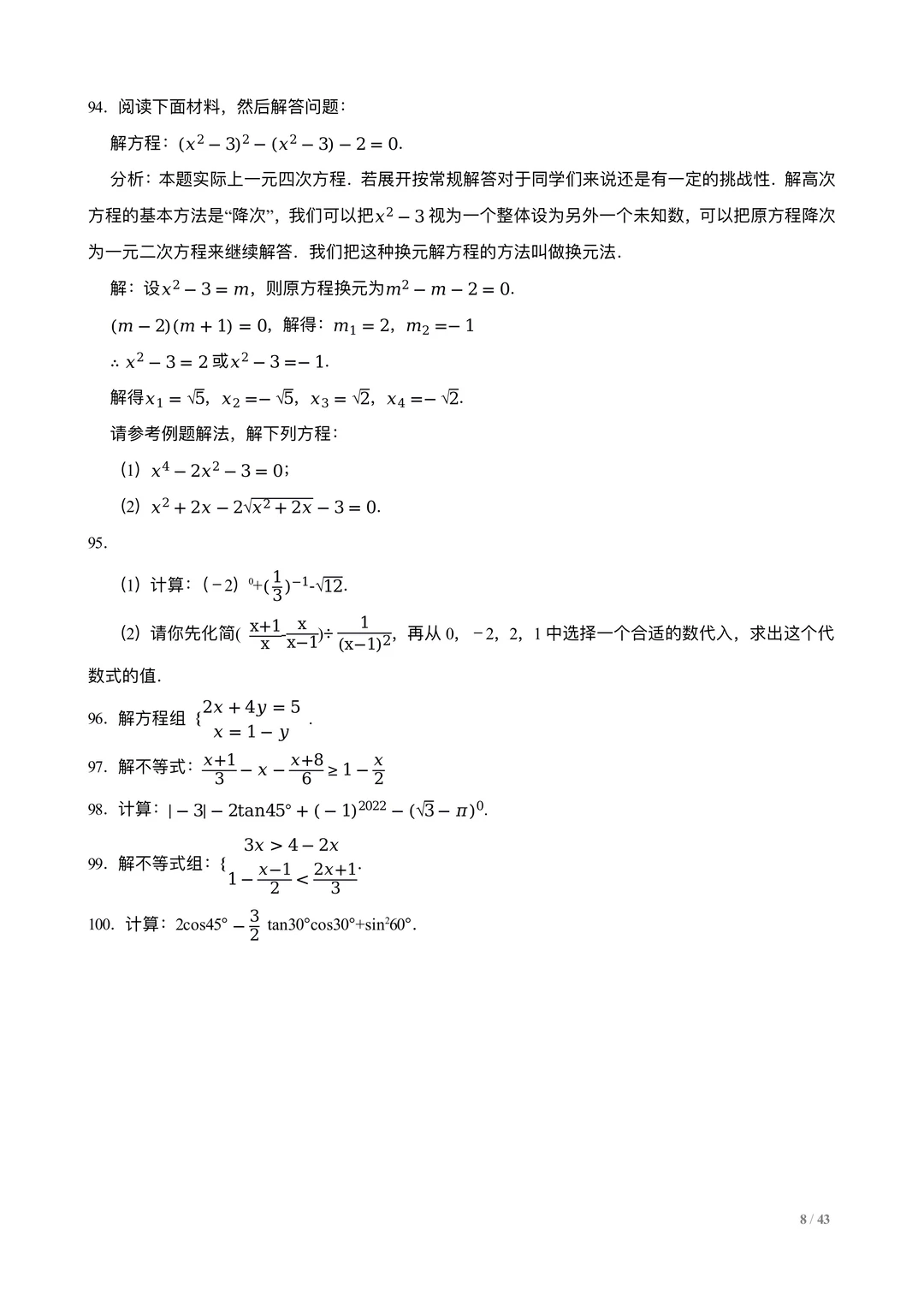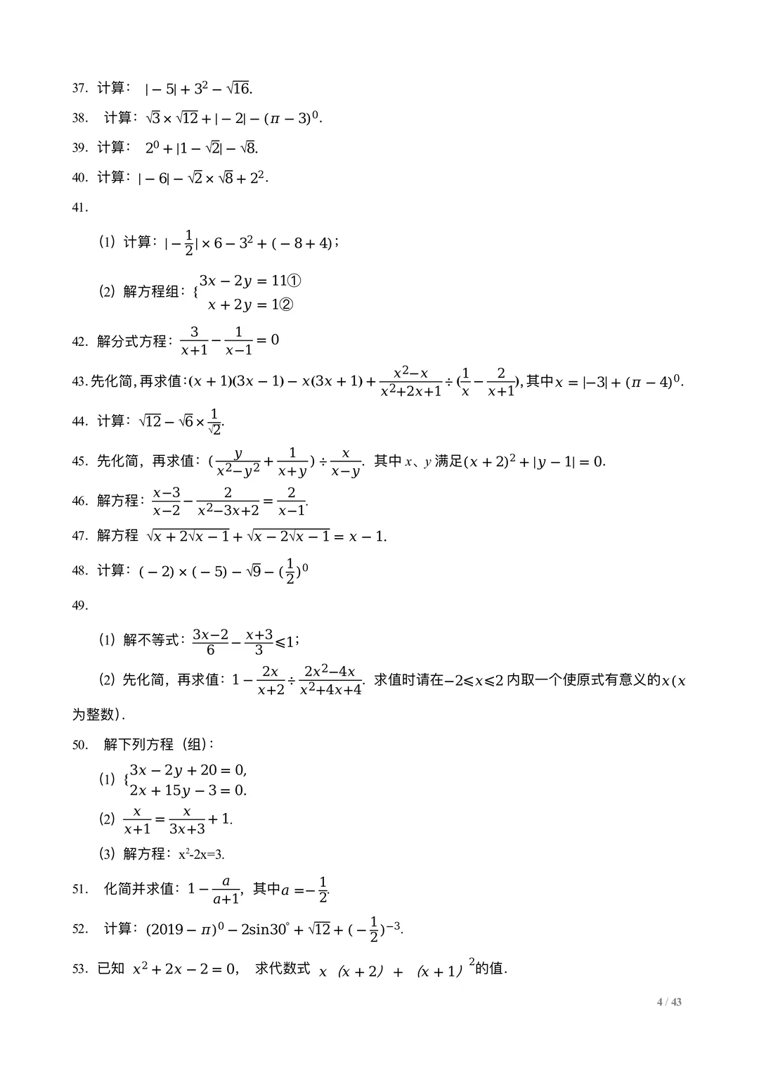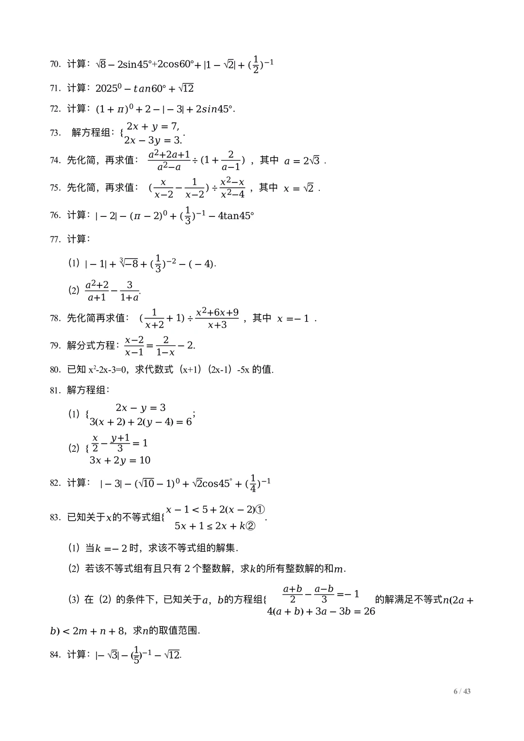 中考数学计算训练100题