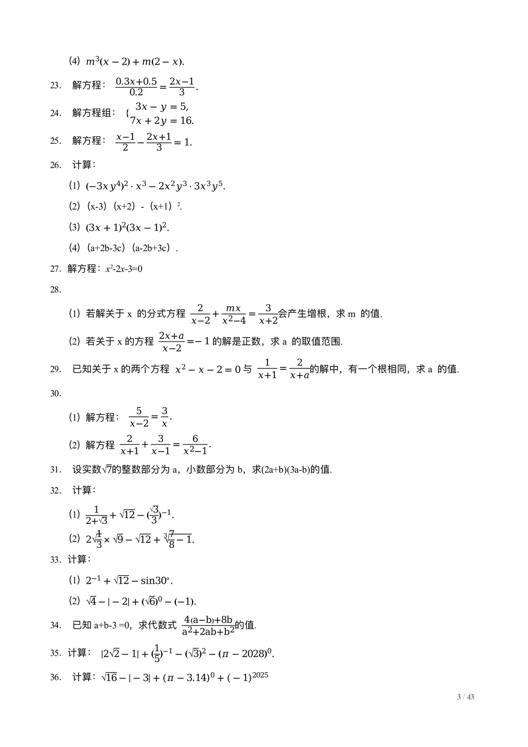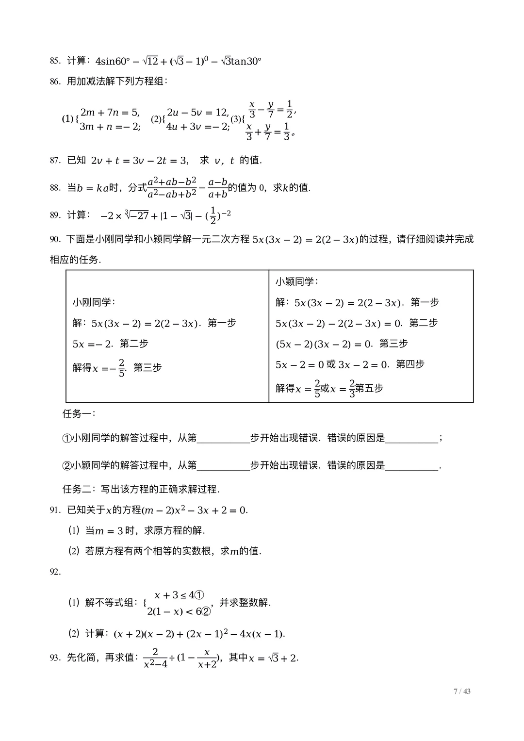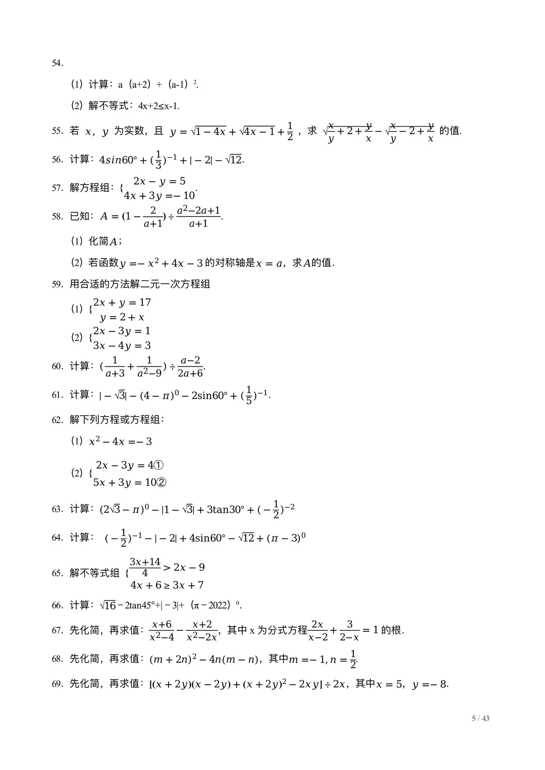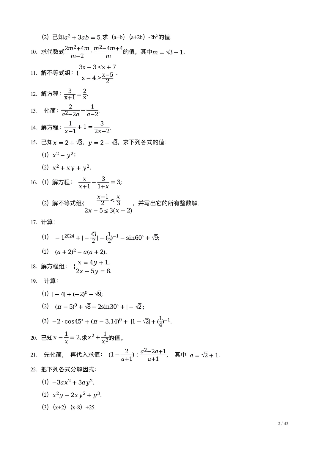 中考数学计算训练100题