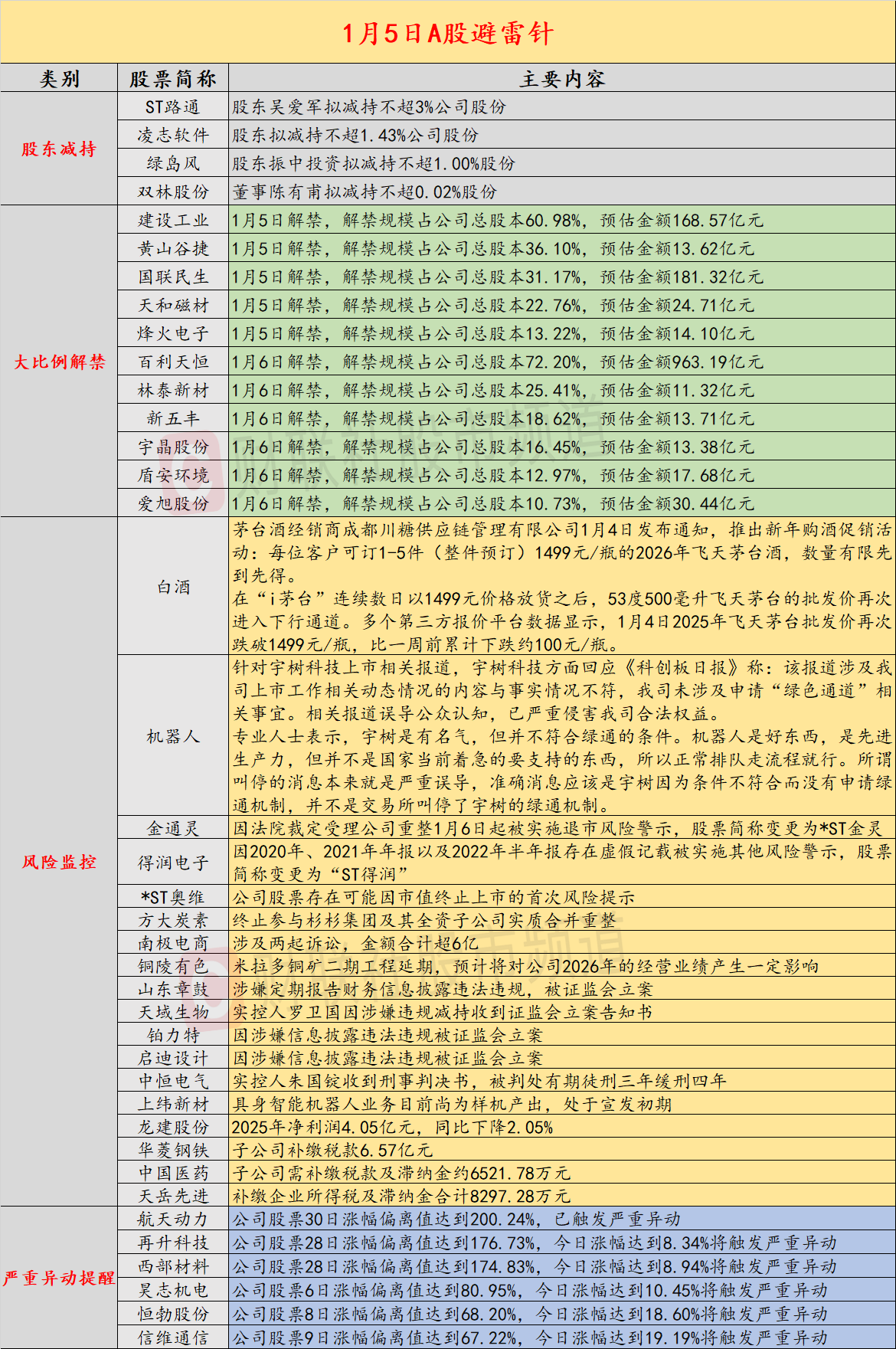 导读:财联社1月5日投资避雷针,近日,A股及海外市场潜在风险事件如下。国内经济信息方面包括:1)宇树科技称IPO正常推进中,未涉及申请“绿色通道”相关事宜;2)飞天茅台批发价再次进入下行通道;公司方面重点关注包括:1)金通灵因法院裁定受理公司重整1月6日起被实施退市风险警示,股票简称变更为*ST金灵;2)得润电子因2020年、2021年年报以及2022年半年报存在虚假记载被实施其他风险警示,股票简称变更为“ST得润”;海外市场重点关注包括:1)特朗普称抓获委内瑞拉总统马杜罗及其夫人并带离委内瑞拉;2)上周五美股三大指数收盘涨跌不一,特斯拉、微软跌超2%。