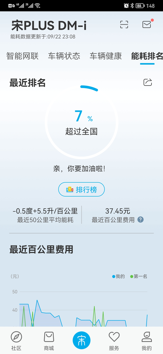 宋dmi高速亏电油耗实测 能耗分享 开车从广州到深圳,全程80%高速。跑了103公里,掉了143公里续航。eco模式,25% soc,一个人开车,没有行李,空调2格,外循环。驾驶风格中等偏激进。 这辆车油箱60升,油表显示1100公里。也就是说油表是按照百公里5.45升算的。 那么,这趟实际油耗是 143÷103×5.450=7.56 升每百公里。 app显示油耗是5.5升。 真是欢乐表吗?