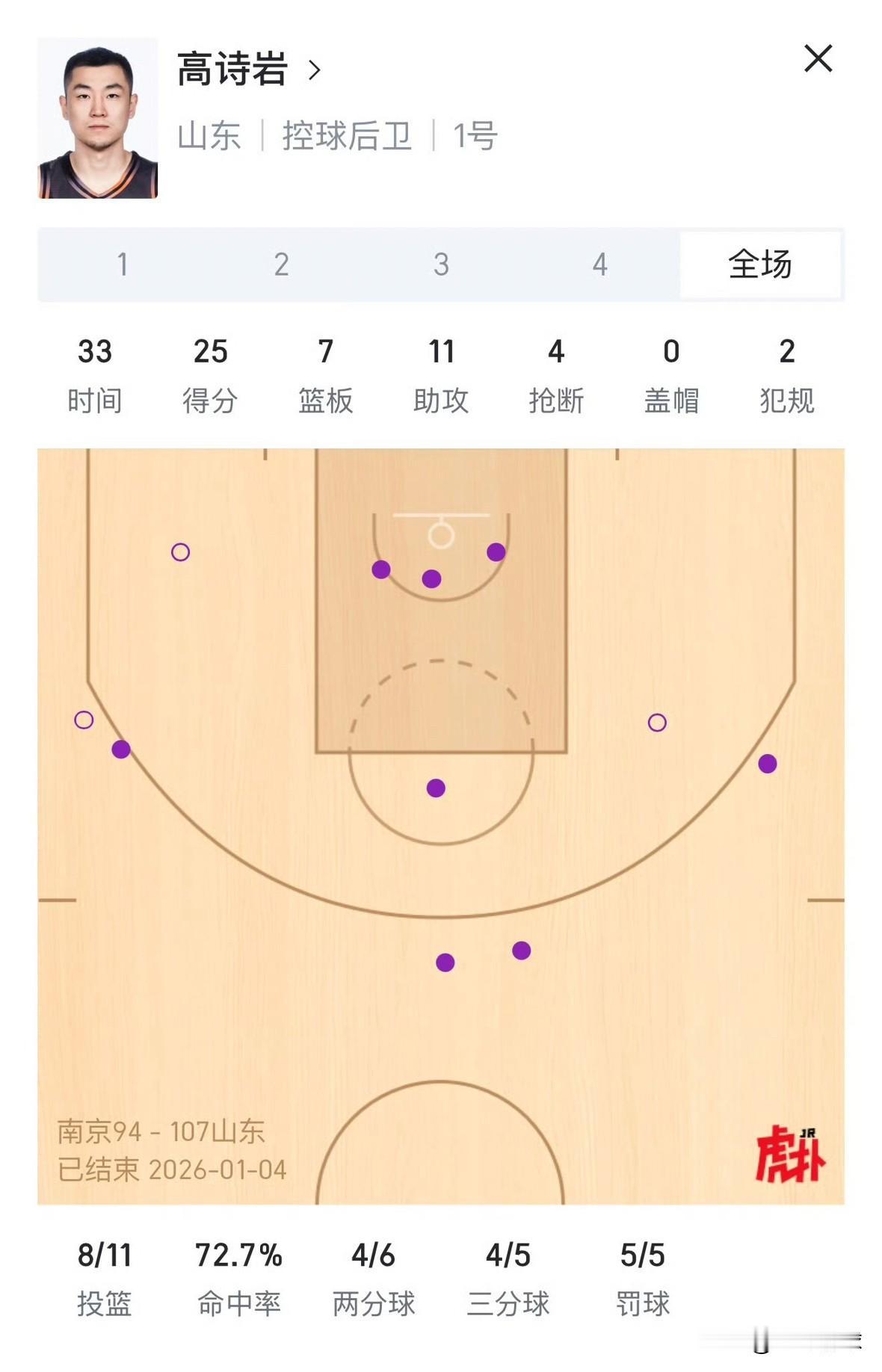 是什么激活了高诗岩!昨晚山东高速客场对阵南京同曦,首节就让郭昊文独得12分,紧接着克里斯、邱彪被裁判双双驱逐出场,随后,高诗岩就爆发了,单节锁死郭昊文,两断郭昊文,全场三分球5中4,拿下25分7板11助4断,最终帮助山东高速107-94击败南京同曦,取得三连胜!