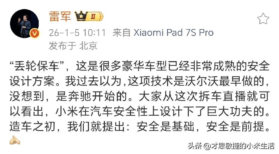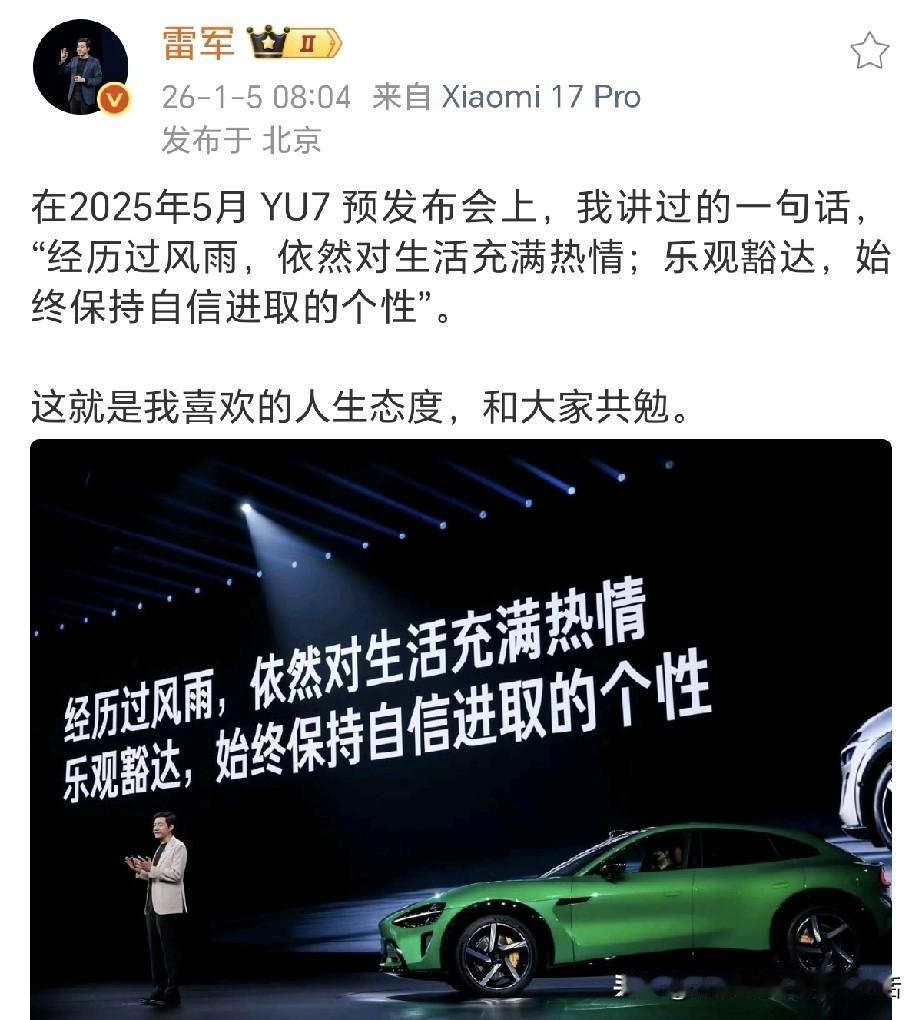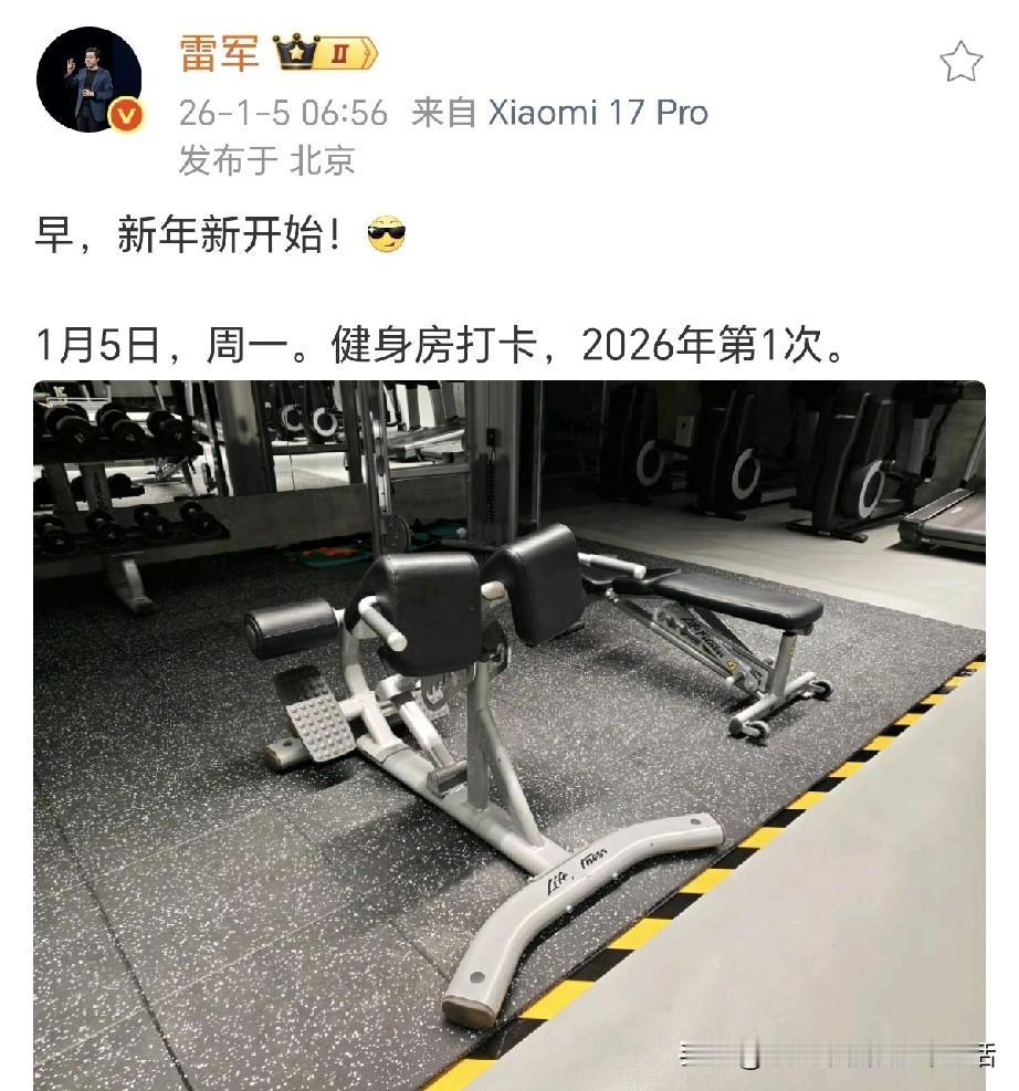 这个世界上我最佩服的人就是雷军了, 雷军真的是所有人的偶像。 你说他这么有钱了,还这么努力,还这么拼命,还能做到做到这么自律! 雷总前一天刚立的新年2026年flag:健身打卡100次,学会叉车,交付55万辆小米汽车。 第二天就付出了行动,立马就去执行了,去健身房打卡了,1月5日,周一,2026年第1次健身。 ​​​ 在前几天的直播中,网友们都感叹雷总是越来越帅了,而且变得有力量了,前车盖搬起来毫不费力,果然坚持健身的人就是不一样! 今天雷总向大家解析了自己为什么能搬动前车盖,雷总说YU7 蚌式大机盖,有3.11平米,全铝的,重量还好,我还可以搬得动。如果是钢的,我估计我肯定搬不动。这个机盖,由于超大,开发的工艺难度比较高。 今天雷总还分享了“丢轮保车”,雷总表示这是很多豪华车型已经非常成熟的安全设计方案。我过去以为,这项技术是沃尔沃最早做的,没想到,是奔驰开始的。 要不是雷总说出来,我也是一直以为“丢轮保车”是沃尔沃的最开始实施的! 今天雷总还分享了自己喜欢的人生态度,“经历过风雨,依然对生活充满热情;乐观豁达,始终保持自信进取的个性”。 雷总的正能量!治愈又有力量!热情乐观又自信!小米汽车也会越来越好!你们觉得呢?