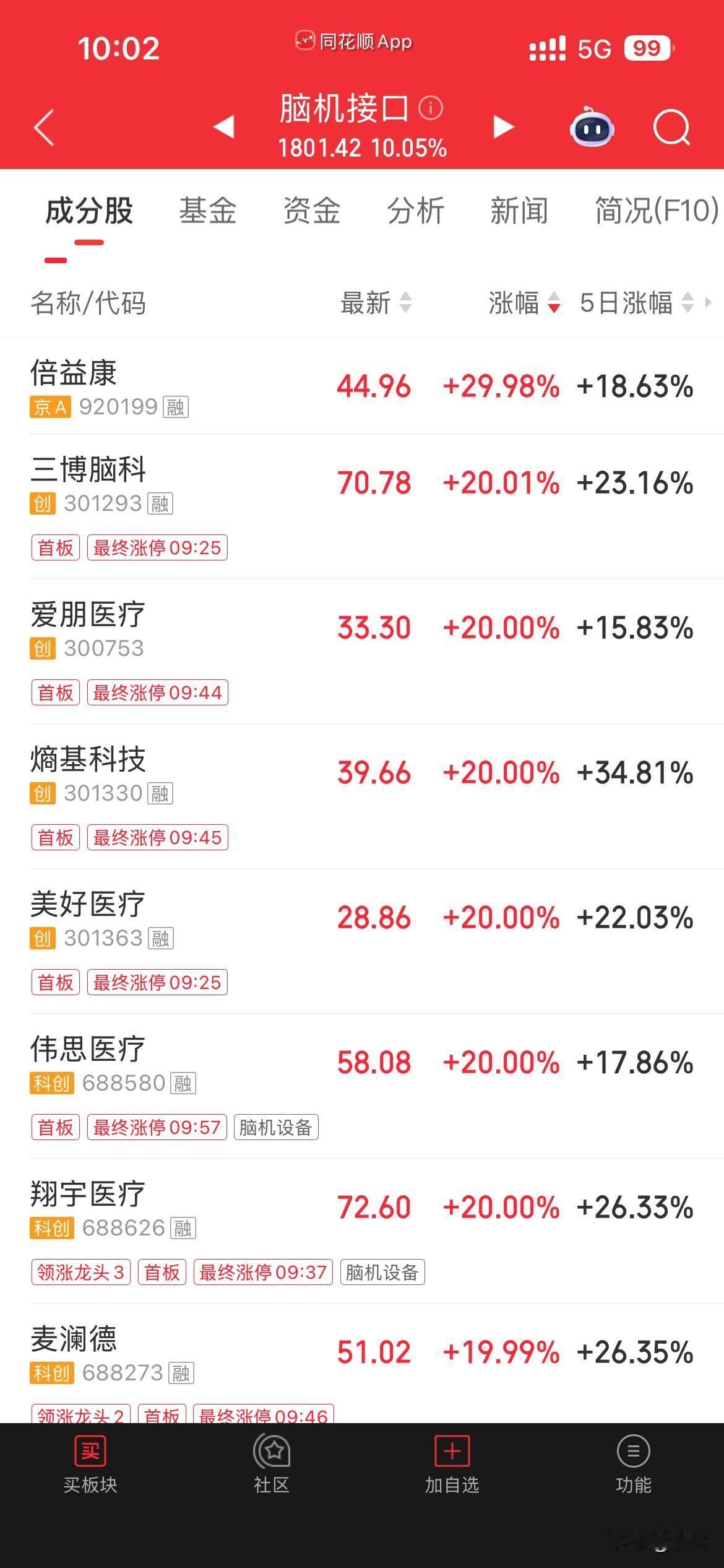 A股新年开盘放量高开高走,脑机接口概念涨幅超过10%,相关股票集体大范围涨停。其次商业航天蓝箭航天概念股也集体大涨,金风科技涨停、诺瓦星云涨超17%、斯瑞新材涨超12%…… 不太理性! 积聚了5天的休市,这姿态简直太吓人,按照这样的涨幅相当于把未来的预期一次性消耗殆尽了,所以预计接下来下午有可能会调整一下。 谨慎追高!
