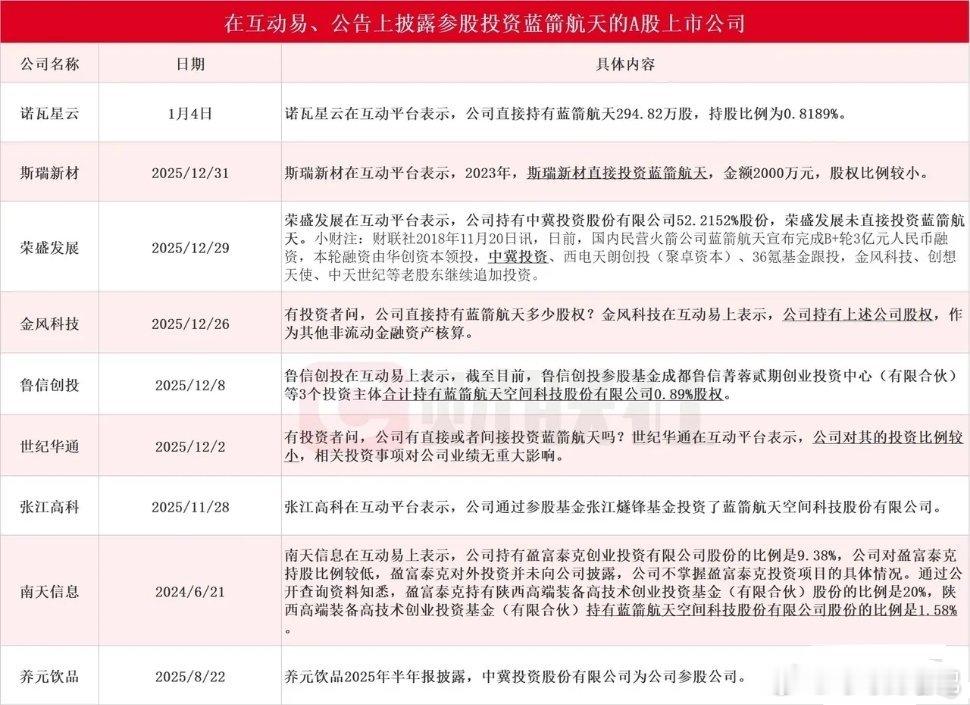 中国版SpaceX蓝箭航天上市在即,作为国内第一家真正意义上的商业航天企业,在商业航天板块已经走了两个多月的情况下是将其板块推向一个全新高度还是为这股热情画上一个终结符号呢? 关于蓝箭航空的相关概念股可以值得期待一下。有9家A股上市公司披露参股投资了蓝箭航空,分别是:1、诺瓦星云、斯瑞新材、荣盛发展、金风科技这四家为直接持股关系;2、鲁信创投、世纪华通、张江高科、南天信息和养元饮品 为通过投资公司间接投资了蓝箭航空。a股