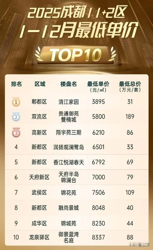 同一个成都,房价冰火两重天。 在过去的2025年成都房地产市场新房销售下降7.8%、二手房成交上涨1.1%,这在全国房地产市场普遍偏冷的行情来说是十分可喜的成绩了。 都说成都是一个很有包容感的城市,无论是亿万富翁还是工薪牛马都能在成都找到适合自己的生活方式和乐趣,成都也会欢迎每一个人留下来。 因此,在过去的2025年成都的房地产价格我们也看到了成都的这一面,有最高单价259985元/平方、单套价格5661万元,也有单价3895元/平方、单套价格仅31万元,而且据不完全统计目前成都在售的二手房超过几十万套都是跌破开盘价在销售的。 成都的高房价自然有其买主,成都是低成本慢生活也有其必然性。