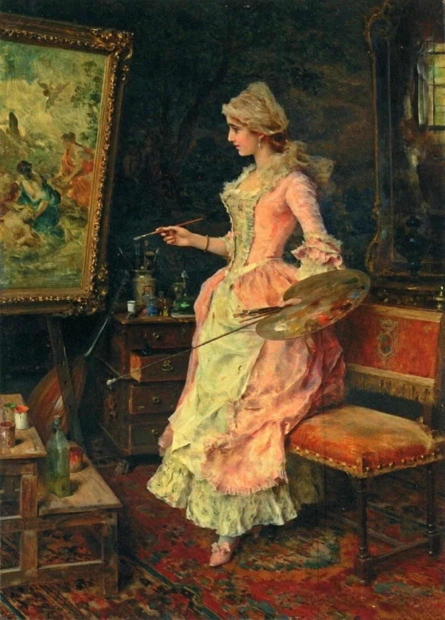 复古画室中的优雅女子,专注作画,古典与艺术的完美结合。