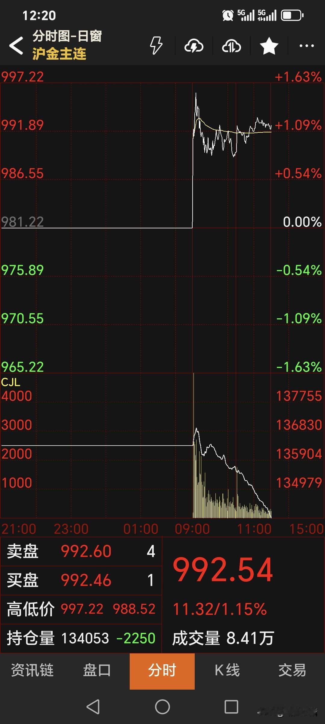 元旦假期后的 第一个交易日, 贵金属开门红。 黄金期货大幅高开, 盘中最高升至997.22元, 上午持续偏强运行。 截止11:30分, 国内黄金期货 主力合约停收于992.54元, 上涨11.32元。 关注上方压力情况, 逢高获利平仓比较好!
