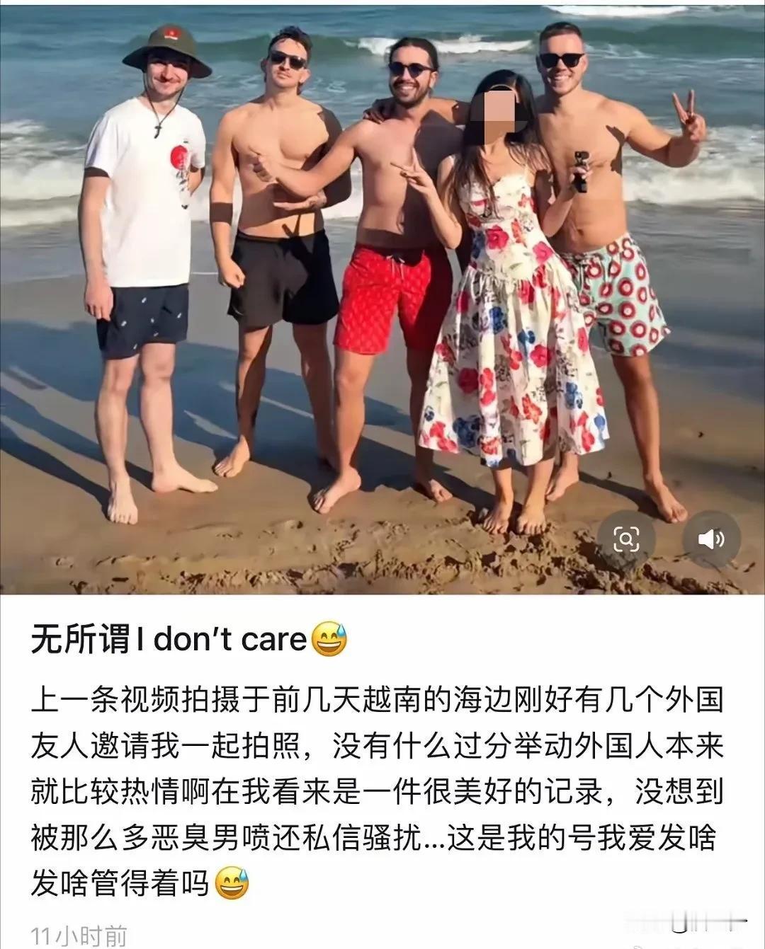“别拿单纯当遮羞布”[尬笑]!近日,一个IP在广东的女孩去越南旅游,在海边游玩时,她遇到几个外国人男子。 估计是在异国他乡遇到外国人有点激动吧,女孩说这几个外国男子很热情的邀请她一起拍照。 女孩也欣然同意了,然后还将照片发出来并配文“不是恋人,单纯的外国人邀请拍照![害羞]” 这一幕也引发了网友的热议。 有的网友说:这女孩心真的好大,能让不认识的人随便背随便搂,她的人生估计也很随便。 有的网友说:女孩应该去印度,印度小哥也很热情。 有的网友说:瞧这搂搂抱抱的亲密劲儿,不说还真以为是热恋情侣呢!出门旅游遇人合拍拍照挺正常,就是这距离感也太容易让人误会啦! …… 我认为作为一个女孩子,出门在外一定要学会保护自己,一定要有足够的常识和安全防范意识。 而且作为一个女孩,要想得到别人的尊重,首先一定要学会自尊自爱! 像这样跟几个异国陌生人又是搂又是背的,还笑的那么开心,真的会让人觉得非常轻浮和随便!很容易让人看不起!