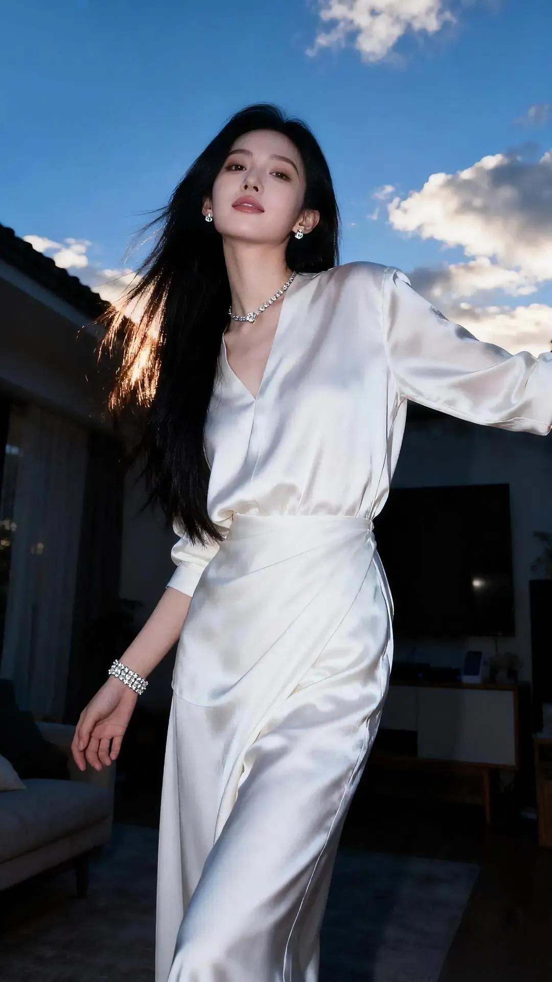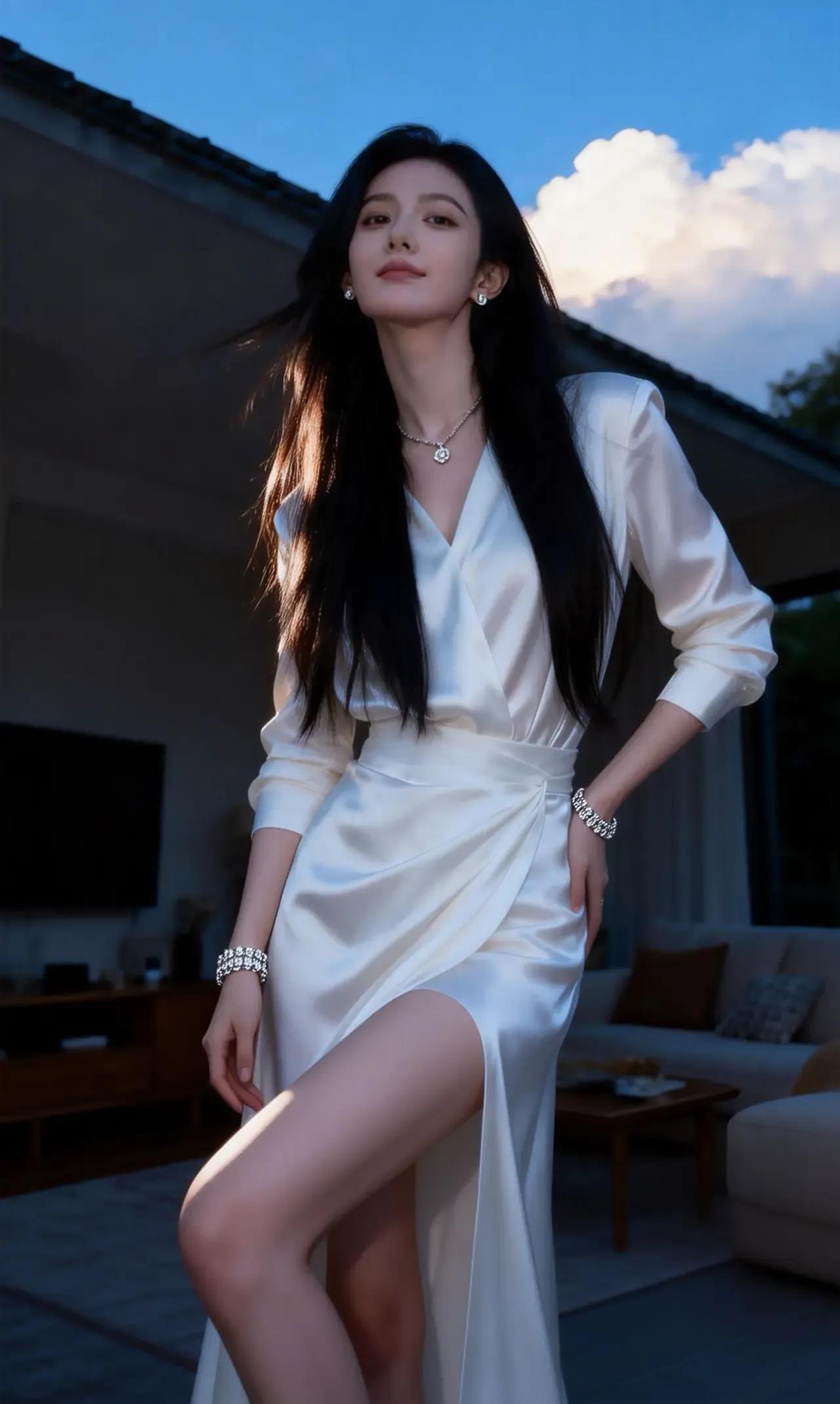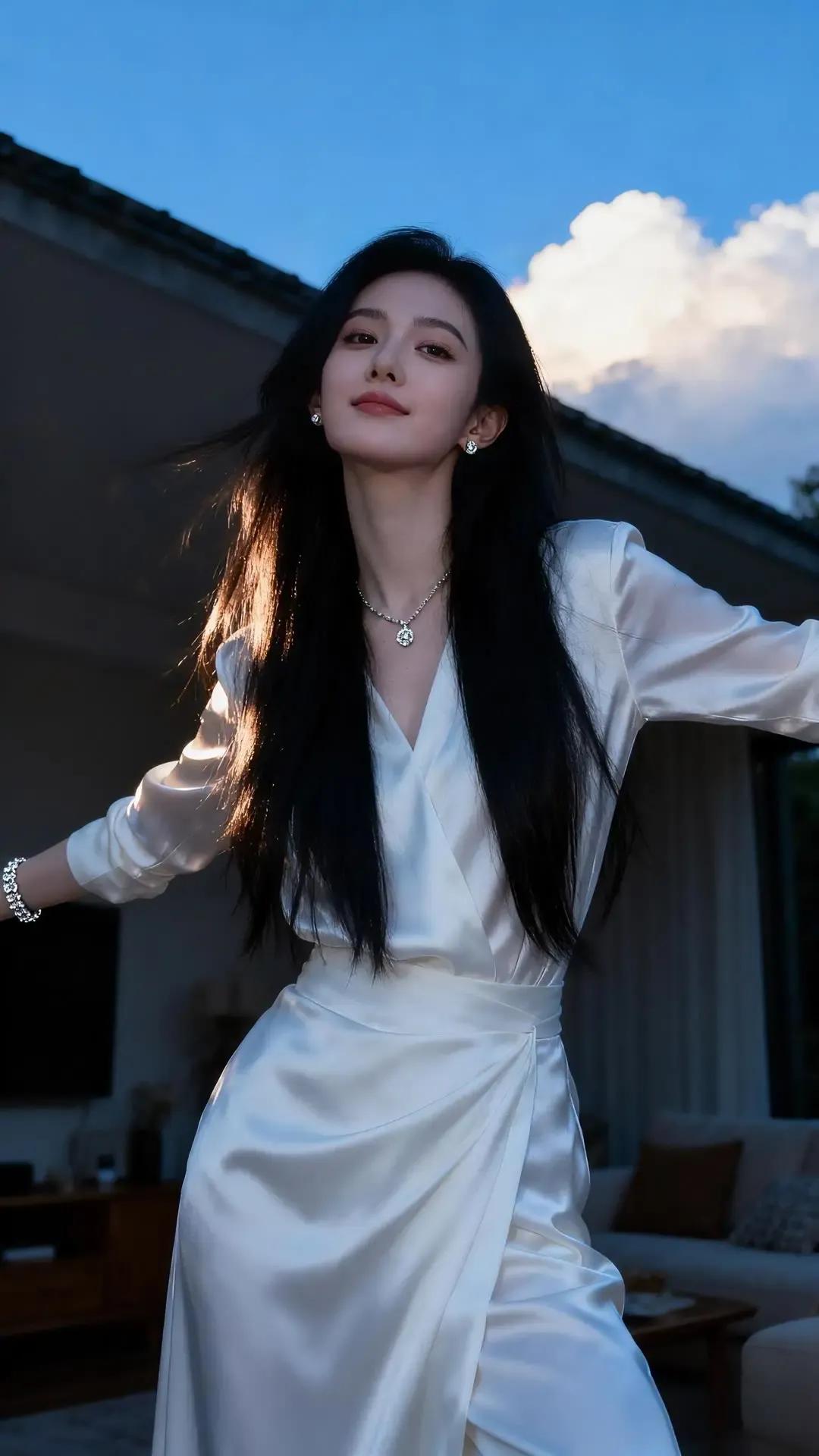 夜晚的阳台,优雅的白色长裙,微风拂面,宁静而美丽。