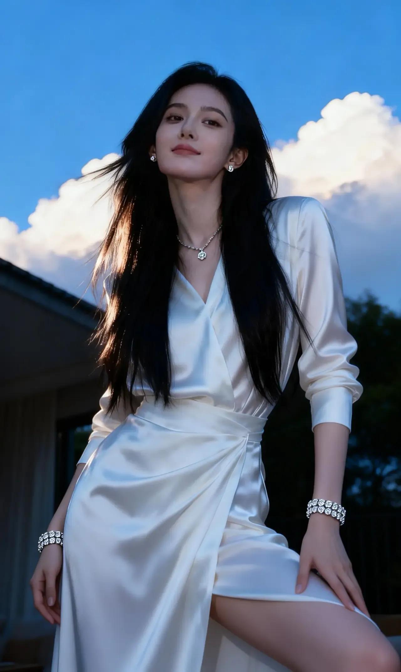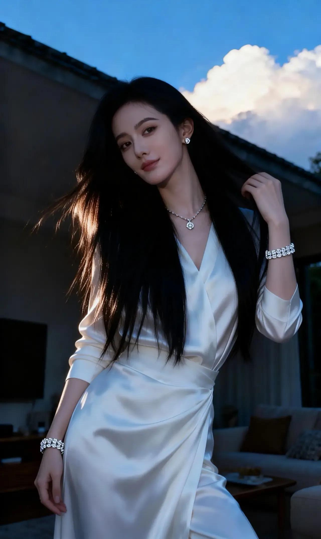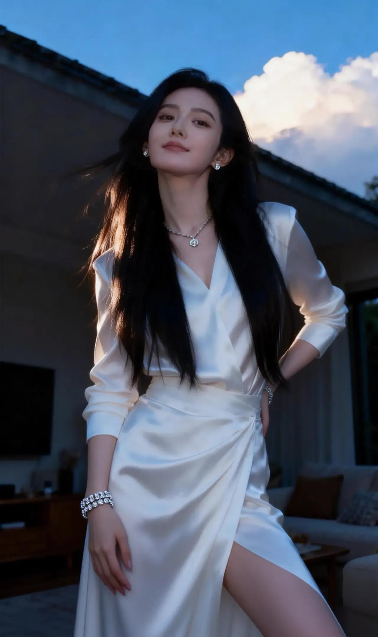 夜晚的阳台,优雅的白色长裙,微风拂面,宁静而美丽。