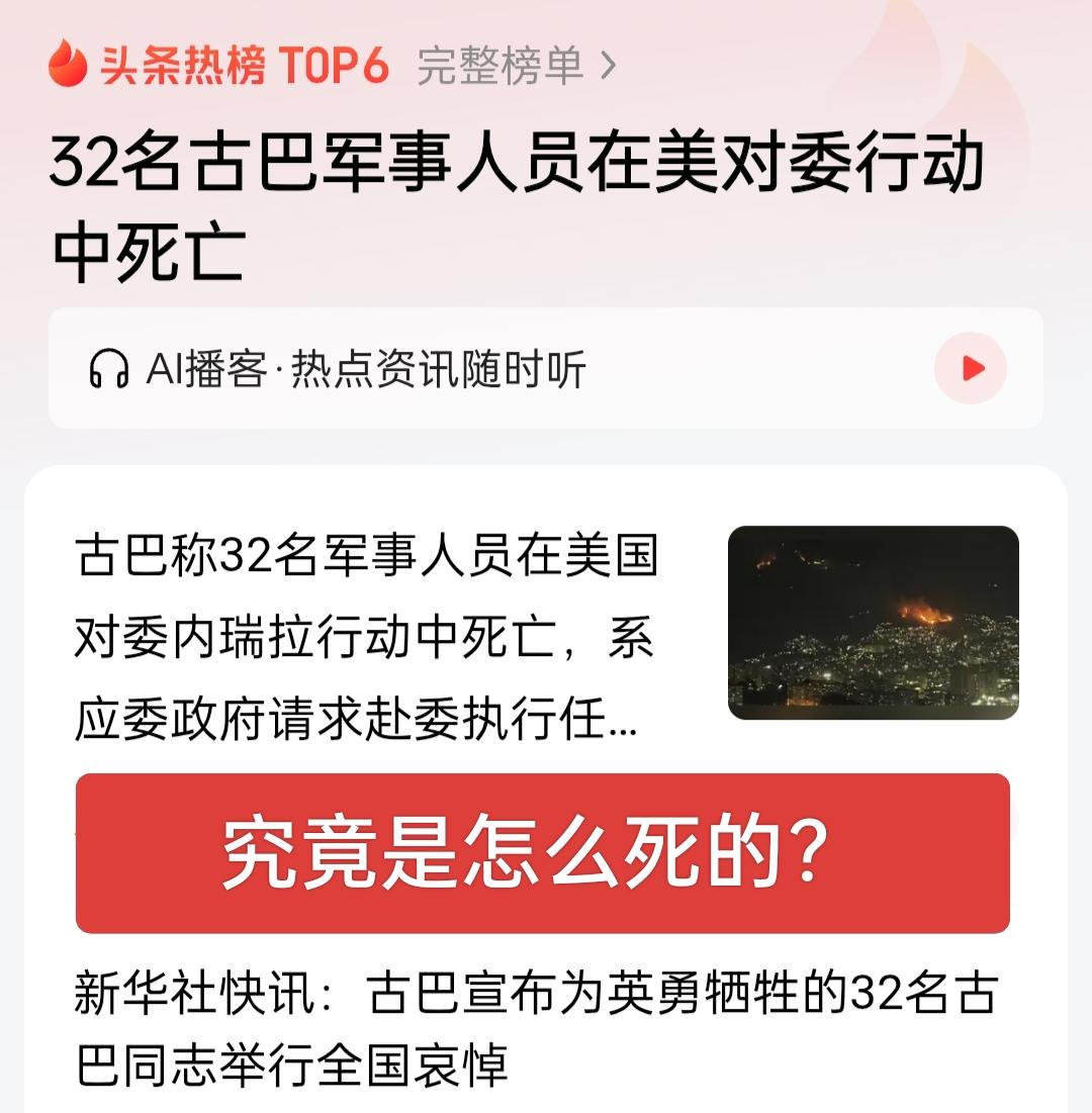 古巴军事人员虽败犹荣!他们忠于职守,英勇牺牲也要保护自己的主顾,这些都是精英军事人员,肯定发生了激烈的交火,那为何马杜罗还在睡梦中呢? 别的卫队人员在干什么呢?几千人的卫队全部熄火了,细思极恐呀!渗透能力太强了!