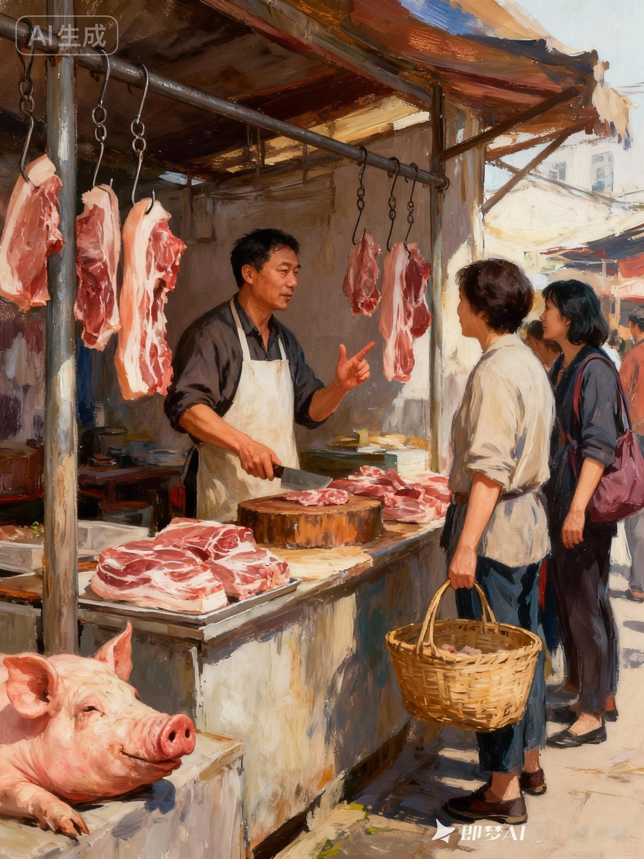 市集上的新鲜猪肉,摊主热情推荐,顾客满意选购。