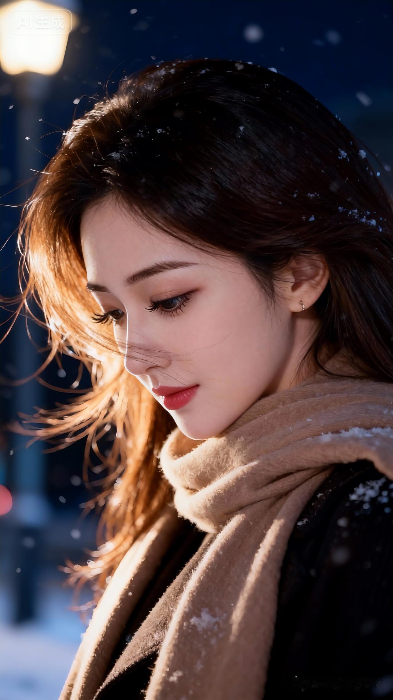 冬日暖阳下的温柔瞬间,雪花轻拂面庞,暖意融融。