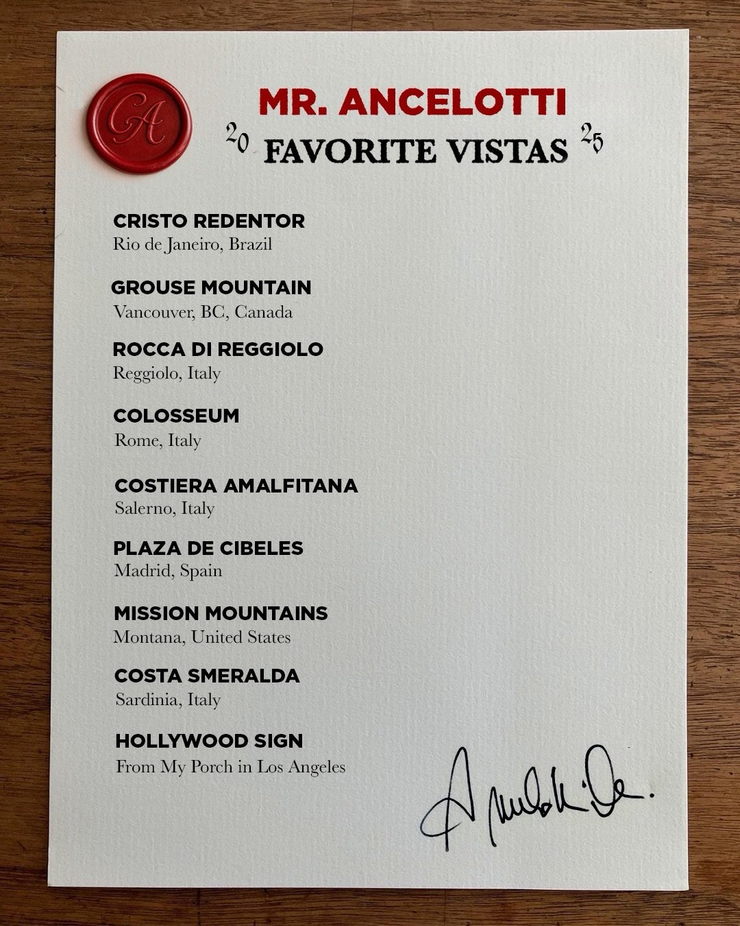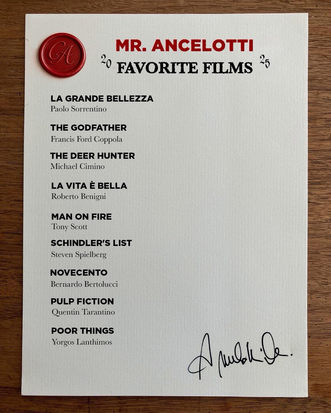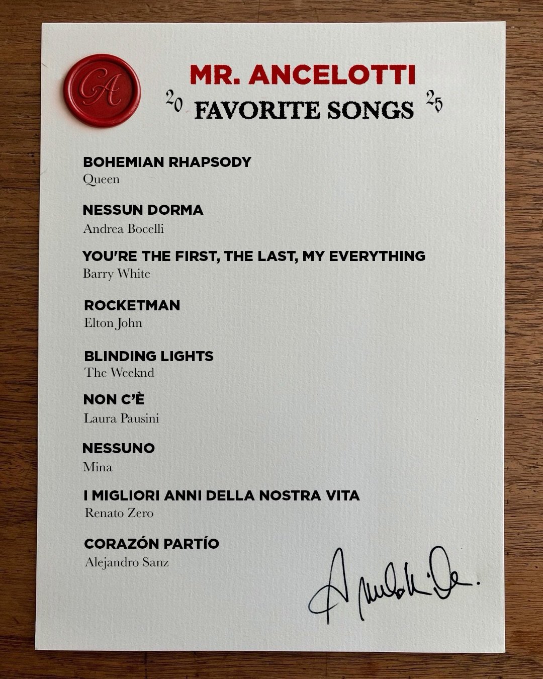 安切洛蒂分享了自己的2025总结:“足球这项运动,让我得以睁开双眼看世界,而那些真正的灵感,往往蕴藏在远离聚光灯的角落。如果这些经历中的任何点滴,能在你的人生旅途中激起一丝好奇、带来一份慰藉,或是引发一段思考,那么我便很乐意将它们分享出来。”【年度最爱美食】· 安吉拉之家(姐姐家)意大利雷焦洛· 斯奎里 trattoria(意式小馆)意大利瓦拉诺德梅莱加里大街· Mocellin 餐厅巴西里约热内卢· 科基餐厅意大利帕尔马· Leña 餐厅· 西班牙马德里· Elisa 餐厅加拿大温哥华· Lucio 餐厅英国伦敦· 三徳寿司苑日本东京· L’Arpège 餐厅法国巴黎【年度最爱歌曲】· 《波西米亚狂想曲》皇后乐队· 《今夜无人入睡》安德烈・波切利· 《你是我的最初,我的最终,我的一切》巴里・怀特· 《火箭人》艾尔顿・约翰· 《盲目之光》威肯· 《此情不再》劳拉・保西尼· 《无人》米娜· 《我们生命中最美好的年华》雷纳托・泽罗· 《破碎的心》亚历杭德罗・桑斯【年度最爱电影】· 《绝美之城》· 《教父》· 《猎鹿人》· 《美丽人生》· 《怒火救援》· 《辛德勒的名单》· 《1900》· 《低俗小说》· 《可怜的东西》【年度最爱景点】· 基督救世主雕像巴西里约热内卢· 松鸡山加拿大不列颠哥伦比亚省温哥华· 雷焦洛城堡意大利雷焦洛· 罗马斗兽场意大利罗马· 阿玛尔菲海岸意大利萨勒诺· 西贝莱斯广场西班牙马德里· 使命山脉美国蒙大拿州· 翡翠海岸意大利撒丁岛· 好莱坞标志洛杉矶(我家的露台视角)