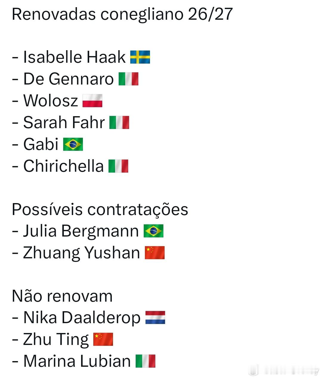 外网来自巴西的加比和哈克铁粉博主pou出科内利亚诺2026/27 赛季阵容人员变动:已续约球员:伊莎贝拉·哈克 🇸🇪德真纳罗 🇮🇹沃沃什 🇵🇱法尔 🇮🇹加比 🇧🇷奇里切拉 🇮🇹潜在引援目标:朱莉娅·伯格曼 🇧🇷庄宇珊 🇨🇳确认离队球员:尼卡·达尔德罗普 🇳🇱朱婷 🇨🇳玛丽娜·卢比安 🇮🇹(排坛动态,一切以官方为准)女排朱婷国际排坛动态