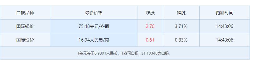 我们知道, 从去年开始, 随着黄金价格的上涨, 银价也跟随上涨, 对于想购买白银的人来说, 了解银价是很重要的。 今日国际银价继续上涨, 国际银价75.48美元, 简单折算成人民币就是16.94元。 不过国内实际购买的话,会比这个价格高一些。