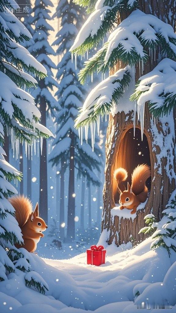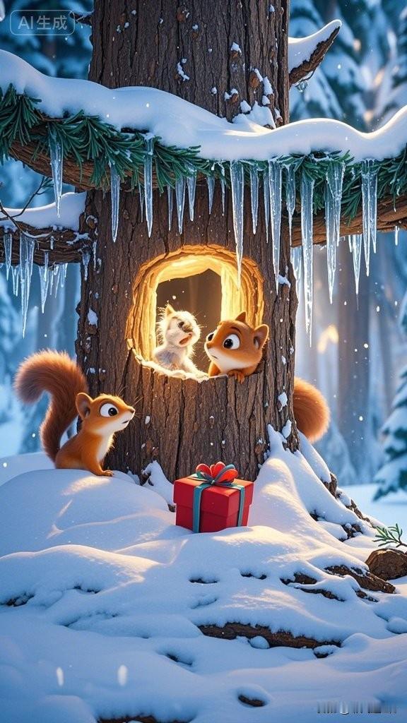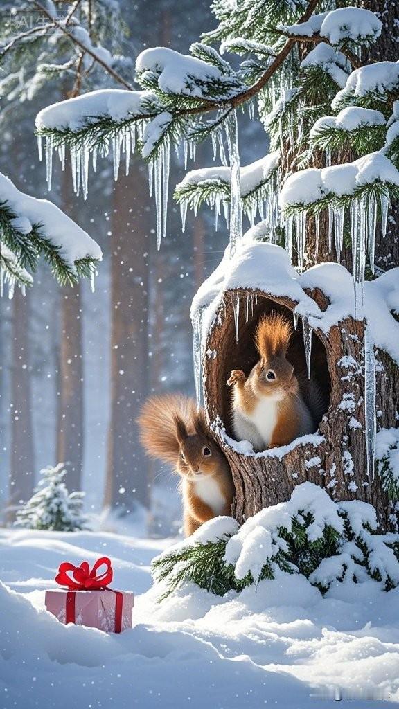 冬日暖阳下,松鼠探头探脑,惊喜礼物在树洞前。🌲🐿️🎁