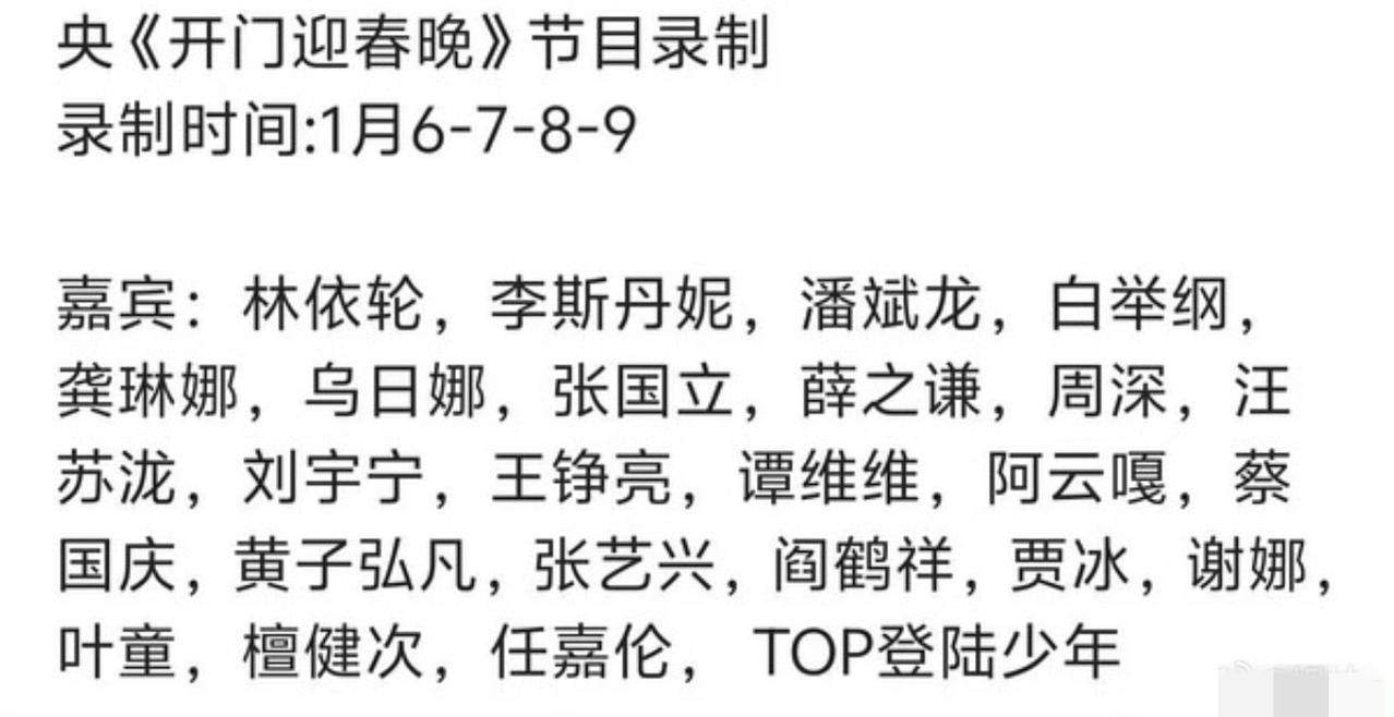 2026年马年央视《开门迎春晚》阵容,都是春晚的老熟人了。 这个名单里面,有多少能上年三十的春晚? 老中青三代聚齐了,有这几年活跃起来的叶童,未露面的张国立,还有春晚常客蔡国庆,中生代周深,薛之谦,王铮亮,谭维维,更有年轻的刘宇宁,登陆少年,还有最近被爆大瓜的檀健次,看来也没受什么影响,最意外的是竟然有谢娜,离开了湖南卫视,谢娜现在是央视的常客了! 《开门迎春晚》算是春晚的预热节目,这个节目播出春晚就不远了,这几天已经开始彩排了,路透参加彩排的有周深,杨幂,刘涛,岳云鹏,毛晓彤,吴磊,唐诗逸,清一色的无绯闻选手,一般来说,最早参加彩排的都是铁板钉钉的! 今年,你期待谁的加入?
