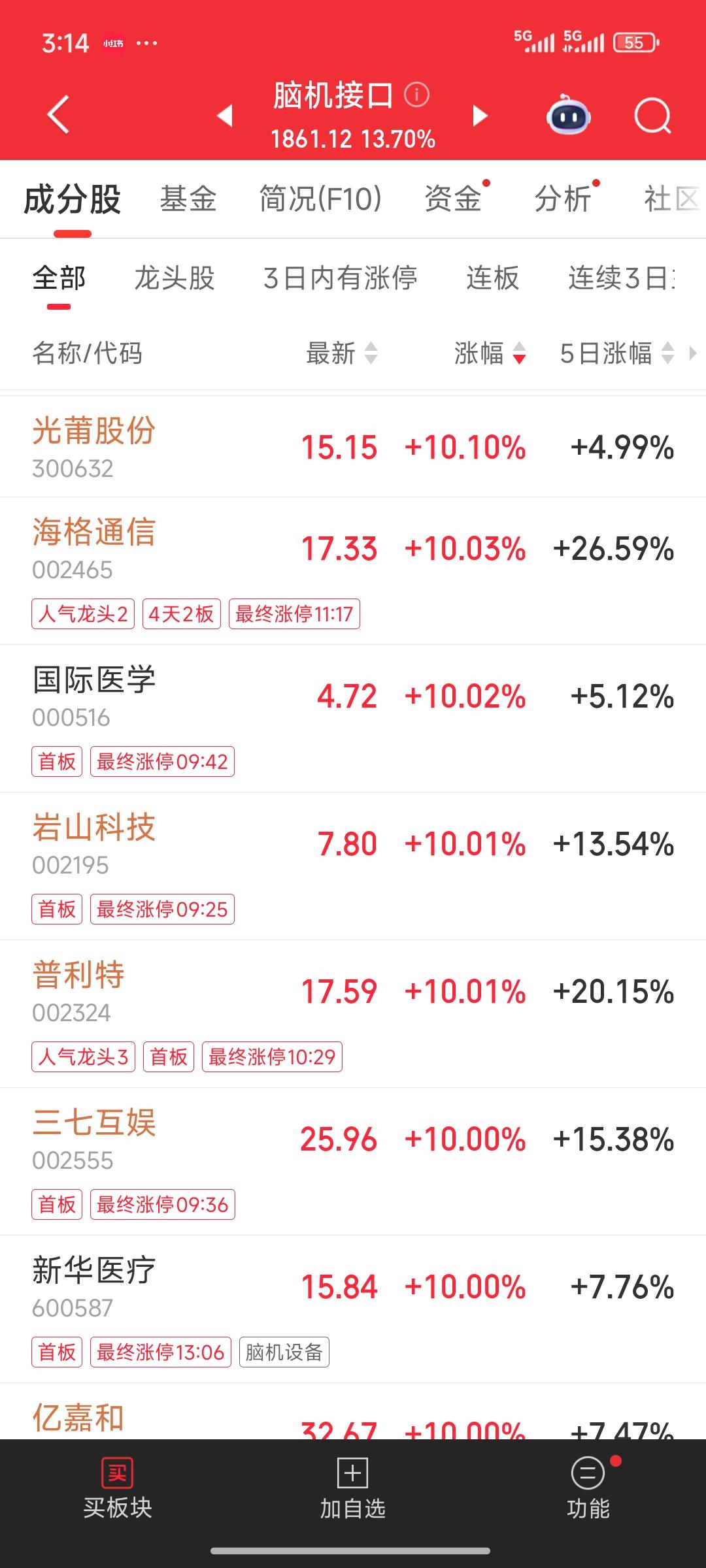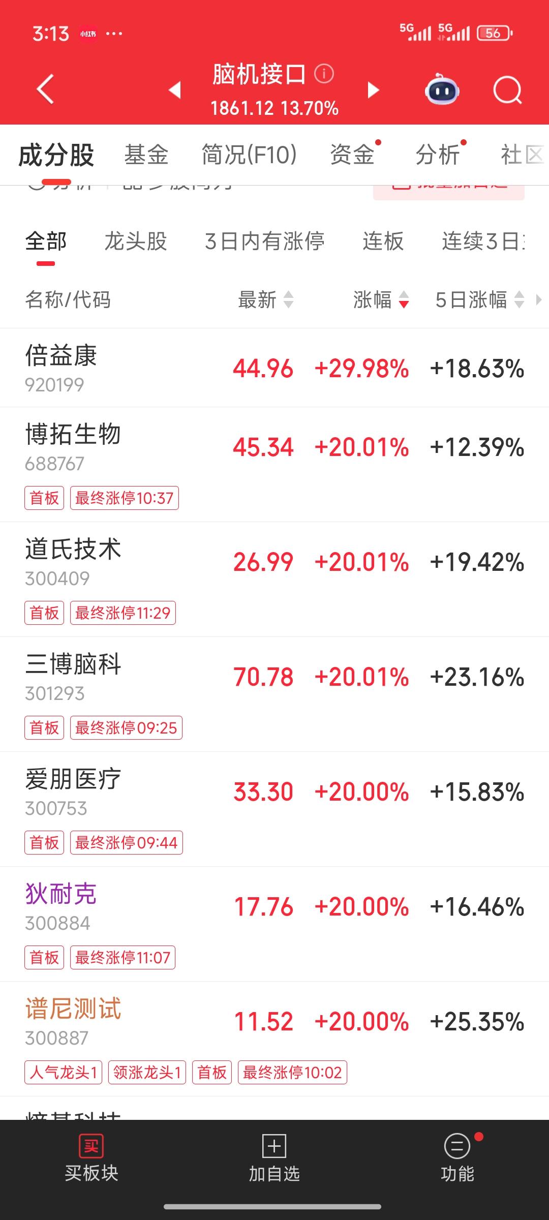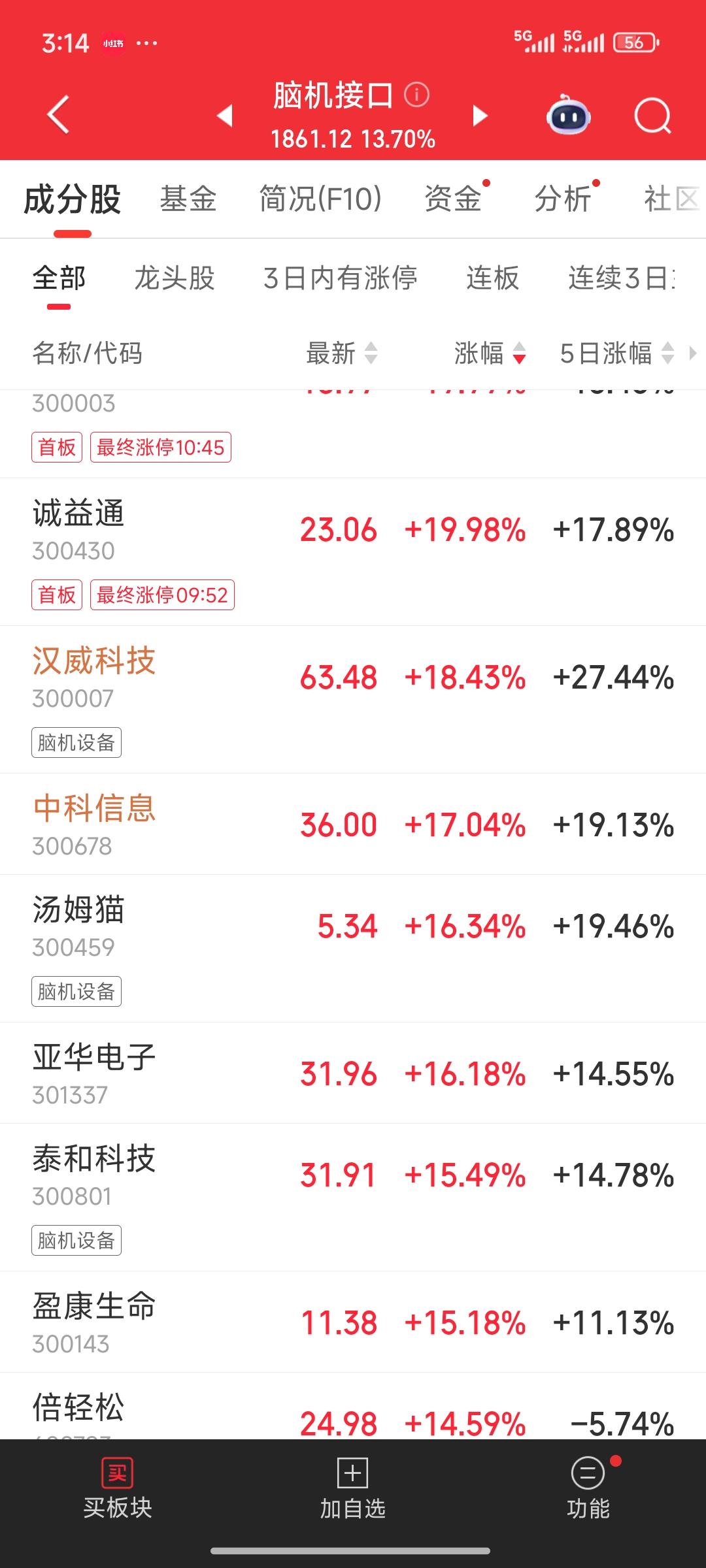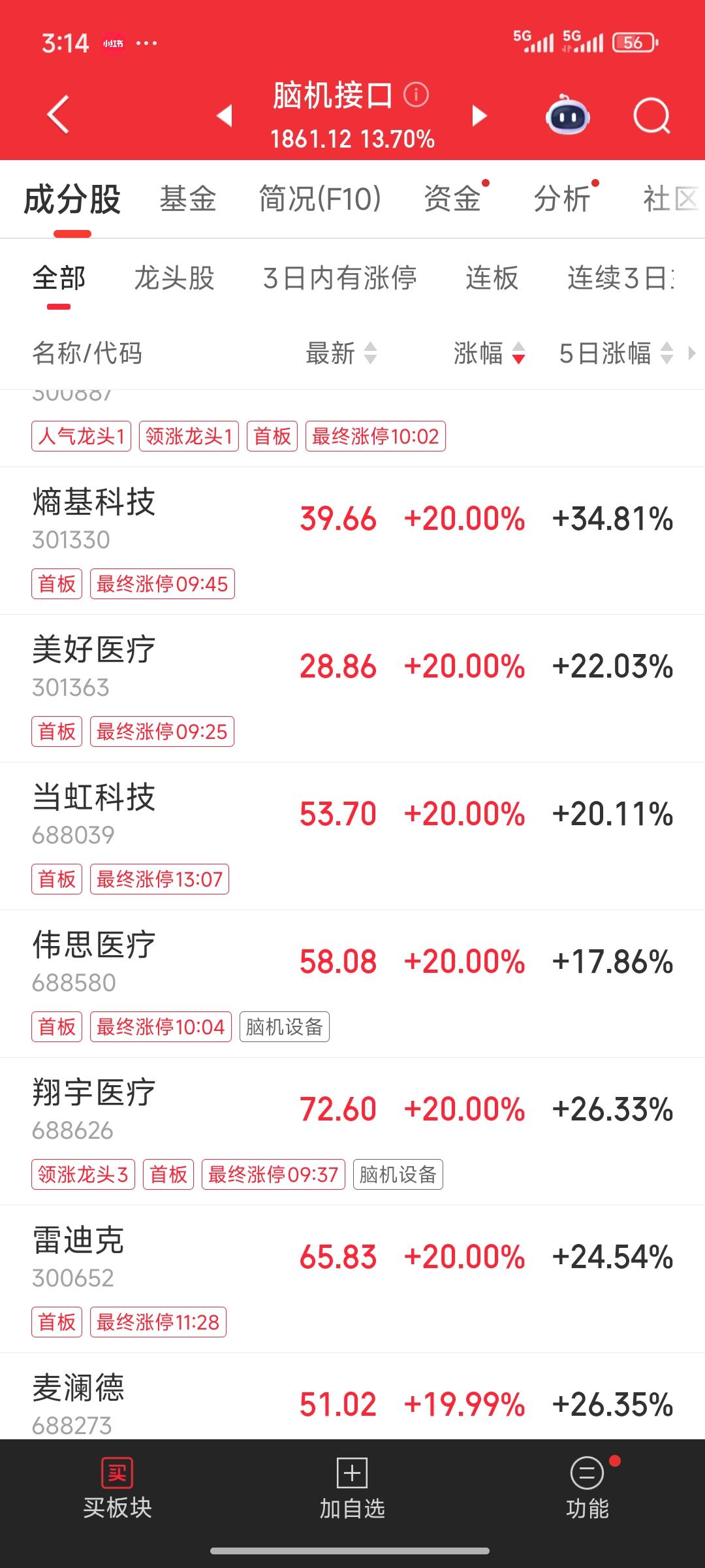 开盘之前,谁能料到,今日最强的板块竟是脑机接口。虽说今年感觉主要有三大热门风格,一是机器人,二是脑机接口,三是商业航天。结果第一天市场就选择了脑机接口。难不成脑机接口的行情,这个月就要开启了?可我还没买入呢,大部分仓位都还在通天股份里套着,兄弟姐妹们。 人机脑接口 脑机芯片 脑基接口 马斯克脑机接口 脑机接口公司 上海脑机接口 脑机接口大会