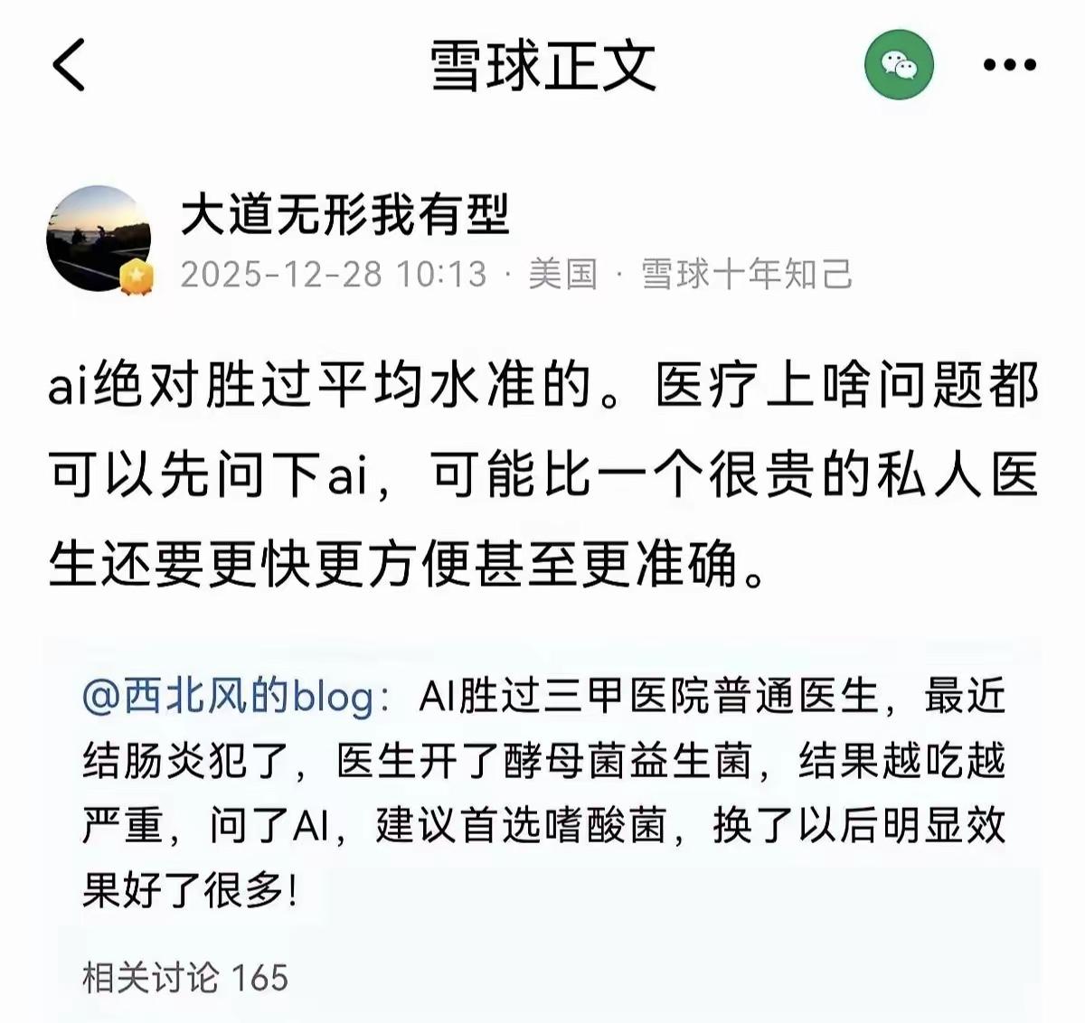段永平的那句话,确实把我给惊到了。一个一亿美元算零花钱、能随时叫来私人医生的大佬,竟然认真回复网友,说AI绝对胜过医生的平均水平,建议医疗上啥问题都先问问AI。 这件事的起因很有代表性。一位网友患上结肠炎,辗转到三甲医院就诊,医生开具了酵母菌益生菌进行治疗。本以为专业诊疗能快速见效,没想到用药后症状反而越来越严重,不仅腹痛没有缓解,还出现了腹胀、腹泻加剧的情况。抱着试试看的心态,他咨询了AI,得到的建议是首选嗜酸菌。抱着怀疑的态度换药后,症状竟然明显改善,这让他忍不住感叹,三甲医院的医生还不如AI靠谱。 网友的经历引发热议,而段永平的回复更是将话题推向高潮。作为商界大佬,他接触的资讯和认知水平远超普通人,私人医生团队也是行业顶尖,却用“绝对”这样笃定的词,认可AI在医疗领域的平均水准,甚至暗示比昂贵的私人医生更准确。这番言论让不少人慌了神,医生可是需要多年寒窗苦读、临床实践才能胜任的高投入岗位,连这样的职业都可能被AI挑战,其他岗位更可想而知。 AI能在部分医疗场景中胜出,并非偶然。现在的医疗AI模型,整合了全球数万份临床指南和数百万份科研文献,还能快速筛选海量病例数据,给出的建议更标准化、不易受疲劳或经验不足影响。 就像国内已有超过100家医院部署了DeepSeek等AI模型,医生在接诊复杂病例时,借助AI能快速获得病因分析和治疗方案,大幅降低误诊风险。基层医院更是受益明显,佛山南海区的社区卫生服务中心用AI导诊,平均耗时仅3.5分钟,效率比人工提升近20倍,还解决了老年患者的语言沟通障碍。 但就此认为AI能取代医生,显然过于片面。宁波就有患者拿着AI诊断的筋膜炎报告让医生开方,结果经触诊和检查,确诊是完全不同的病症;还有年轻女性被AI诊断为阴道炎,实际是细菌性阴道炎合并支原体感染,若按AI建议用药只会延误病情。 医生的核心价值,从来不止于给出治疗建议。培养一名成熟的病理医生需要8到10年,他们能在数万细胞中精准筛选病变细胞;重症医生面对心脏移植后是否撤掉ECMO的关键决策,需要结合患者实时体征和临床经验综合判断,这些都是AI无法替代的。更重要的是,医生能通过问诊捕捉到AI忽略的细节,比如患者的生活习惯、既往病史,还能给予心理安慰,这种人文关怀是冰冷算法难以企及的。 网友对此争议激烈。有人说“AI让普通人也能享受到优质医疗建议,尤其是基层医疗资源匮乏的地区”,也有人反驳“医疗是严肃的生命工程,怎能交给没有感情的AI”,还有人调侃“以后医生会不会变成AI辅助操作员”。 其实,国家卫健委早已出台相关政策,明确AI在医疗领域的84个应用场景,核心定位是辅助工具而非替代者。现在越来越多的医院采用“AI+医生”的协同模式,AI负责筛选常规病例、整理病历、提供参考方案,医生则专注于疑难杂症诊疗和人文关怀,既提升了效率,又保证了医疗质量。 在我看来,段永平的言论并非否定医生的价值,而是点出了AI对医疗行业的补充作用。未来,AI会淘汰的不是医生这个职业,而是那些固守传统、不愿接受新技术的从业者。医疗AI的发展方向,是成为医生的得力助手,让优质医疗资源更普惠,而不是取代医生的核心地位。对于普通人来说,AI可以作为初步咨询和参考的工具,但绝不能替代线下诊疗,身体出现问题时,及时就医、遵医嘱治疗才是最稳妥的选择。 随着技术的不断成熟,AI与医疗的融合会越来越深,但医疗的本质是以人为本,这一点永远不会改变。AI能提供精准的数据分析和建议,而医生能给予专业的判断和温暖的关怀,两者相辅相成,才能让医疗服务变得更高效、更有温度。 文章描述过程、图片都来源于网络,涉及版权或者人物侵权问题,或有事件存疑部分,联系后即刻删除或作出更改