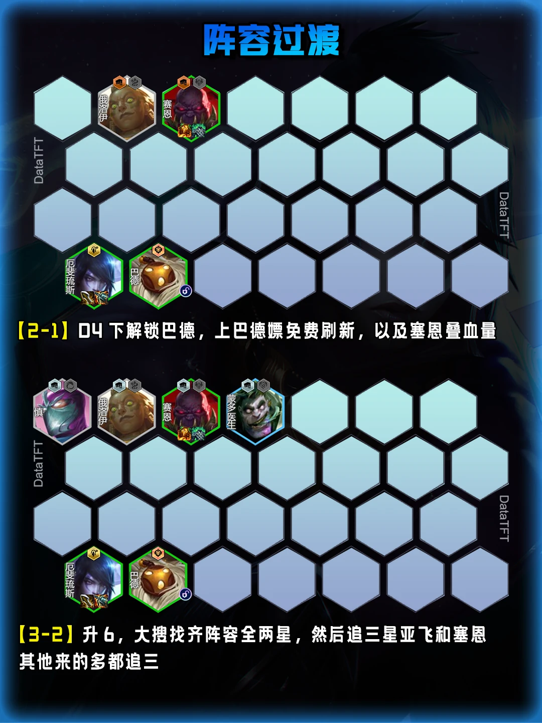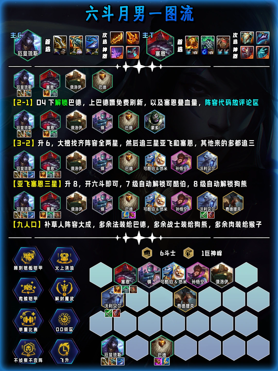 家人们谁懂啊!六斗月男,成型又快又肉,简直是版本上分密码!🔥 ⭐️阵容核心: 主C厄斐琉斯+主坦塞恩,搭配六斗士羁绊叠坦度 月男输出拉满,又肉又有伤害! ⭐️运营节奏: 1️⃣2-1阶段:下4级锁巴德,靠巴德免费刷新+塞恩叠血量 2️⃣3-2阶段:升6级大搜,找阵容全员两星,重点追三星亚飞、塞恩 3️⃣三星成型后:升8级开六斗,7级解锁可酷伯、8级解锁狗熊,9级补稻草人阵容大成 ✅装备&海克斯: 月男堆输出装,塞恩走肉装路线;💪 海克斯优先选荆棘板甲、火上浇油这类坦度/输出加成的🔥 直接把阵容强度拉满!🥇 这套阵容运营简单,成型后稳吃分 冲分的宝子们赶紧码住🐎