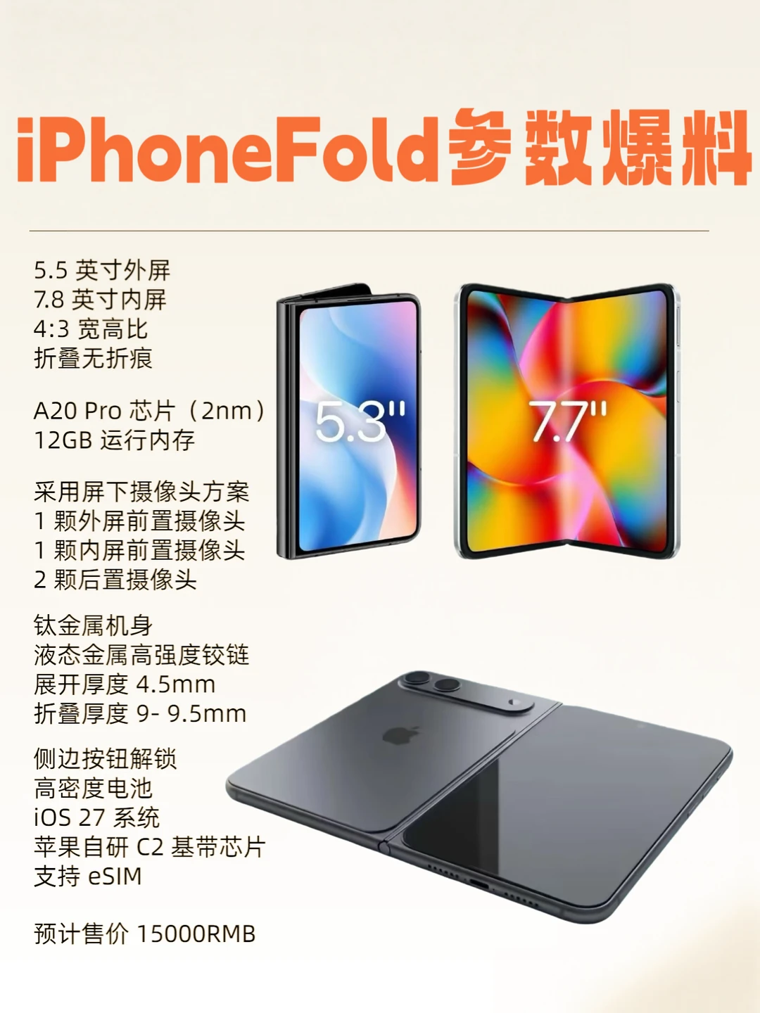 苹果憋了五年的折叠屏终于露真容! 据爆料,这次为了9mm轻薄机身,直接砍掉3D Face ID,回归电源键集成Touch ID设计,这波取舍你站苹果吗?外屏5.3英寸单手好握,内屏7.7英寸4:3宽屏梦回iPad,矮胖造型打破安卓折叠同质化! A20 Pro芯片+iOS/iPadOS双生态加持,起售价或破1.5万,2026年9月同步iPhone 18系列发布~ 没有Face ID的折叠苹果,你会冲首发吗?