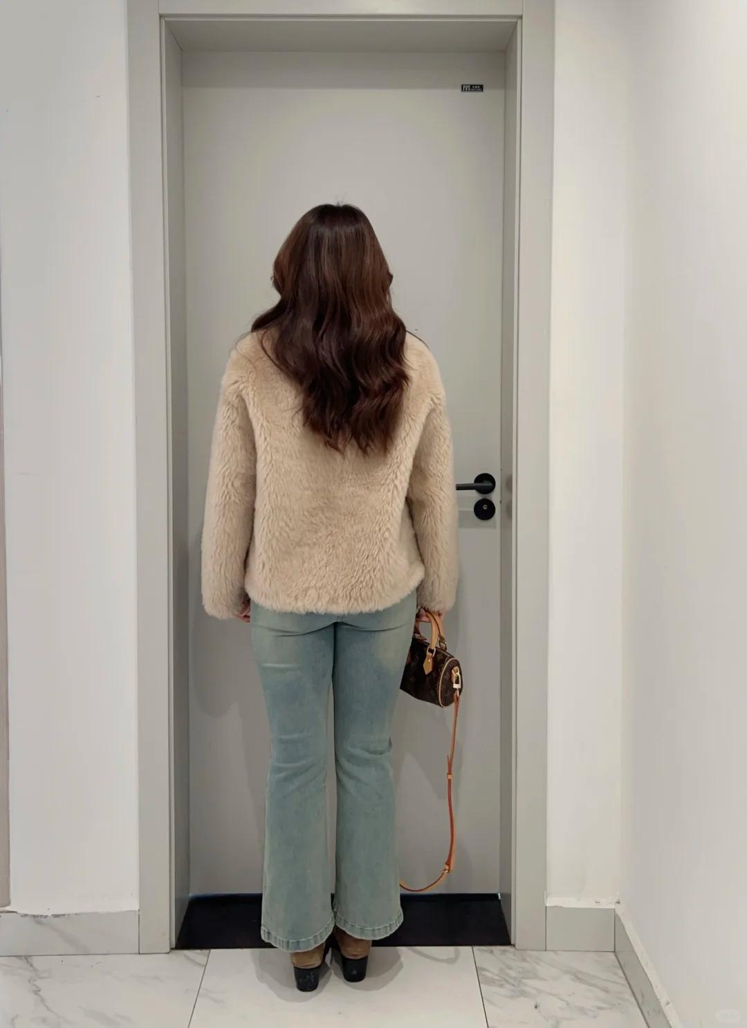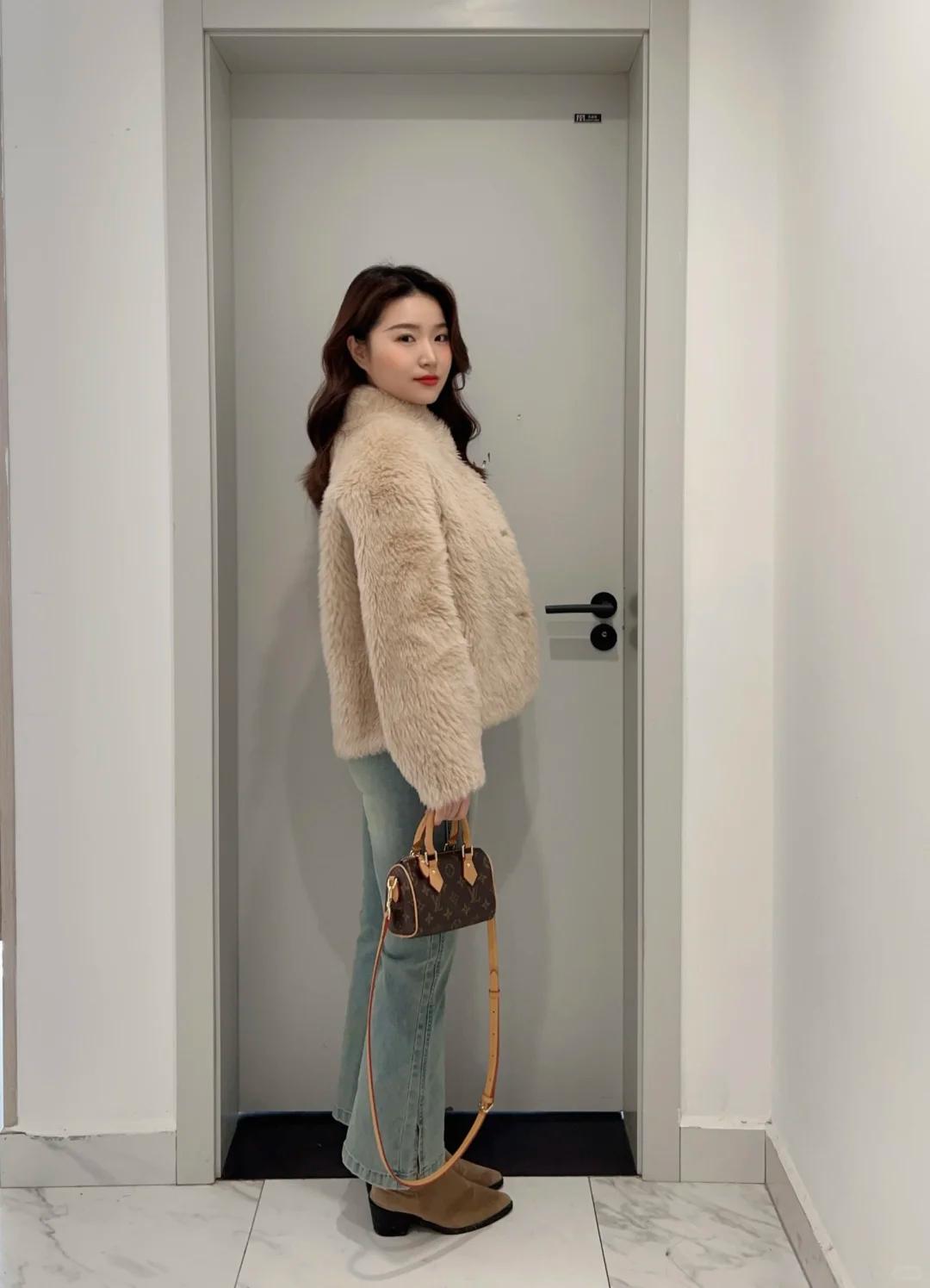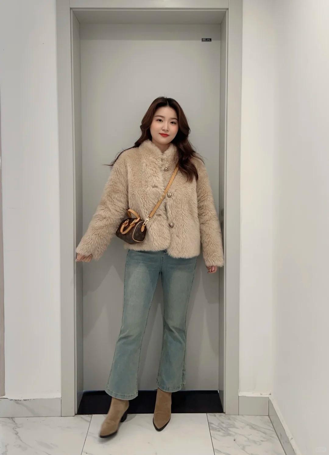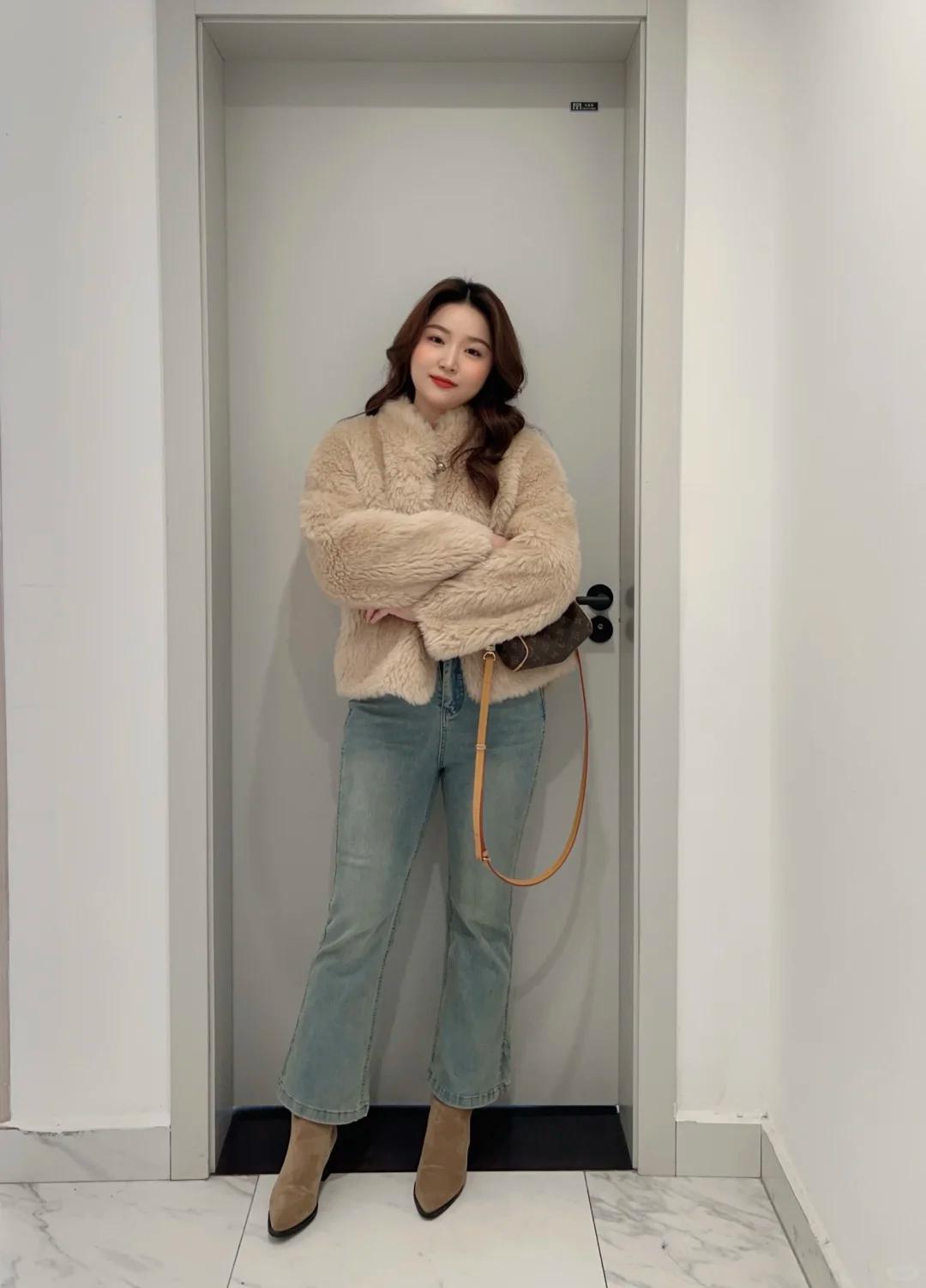 微胖小个子冬日逆袭✨干净清爽又显瘦! 微胖小个子姐妹看过来!这套穿搭简直是冬日救星👏 卡其色短款羊羔毛外套,软糯又温暖,短款设计巧妙拉高腰线,瞬间显高5cm,还把肉肉都藏起来啦~ 内搭咖啡色修身打底衫,贴合身形却不紧绷,勾勒出曲线美,和外套的同色系搭配,高级感拉满。 下半身微喇九分牛仔裤,修饰腿型一绝,遮住小腿肉肉,露出纤细脚踝。再踩上咖啡色短靴,和打底衫呼应,视觉上延伸腿部线条,显高又显瘦。 整套穿搭简单舒适,干净清爽,微胖小个子也能轻松穿出氛围感,快冲!💕