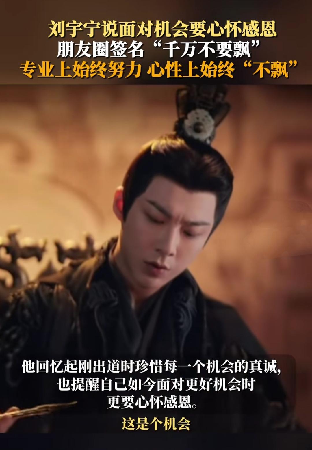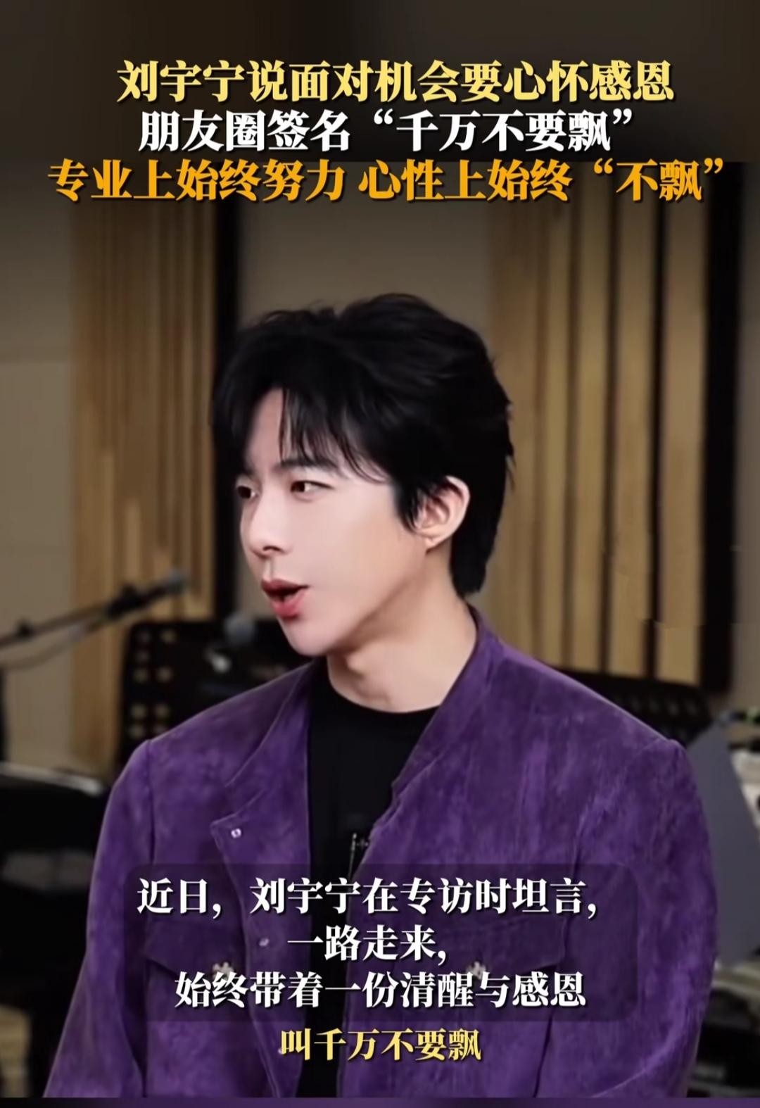 谁能想到,如今影视圈站稳脚跟的刘宇宁,朋友圈签名竟多年没改——就五个字“千万不要飘”。从网红歌手跨界演戏,他起点不算高,却硬生生凭着一股劲走到现在,这五个字藏着的清醒,真的太难得。 刚拍戏时,他知道自己非科班出身,就自掏腰包请表演老师跟组,台词不过关就反复琢磨,角色没吃透就熬夜研究剧本。走红后片约不断,他没趁着热度捞快钱,反而更沉下心打磨演技,不炒作不搞虚的,眼里只有作品。 在流量至上的圈子里,太多人稍微有点名气就飘了,忘了初心。而刘宇宁始终记得“不飘”的底线,既敬畏职业,又清醒自持。其实不管做什么行业,天赋和机会固然重要,但能守住本心、持续深耕,才是走得远的关键。这样的谦逊与努力,活该他被认可!