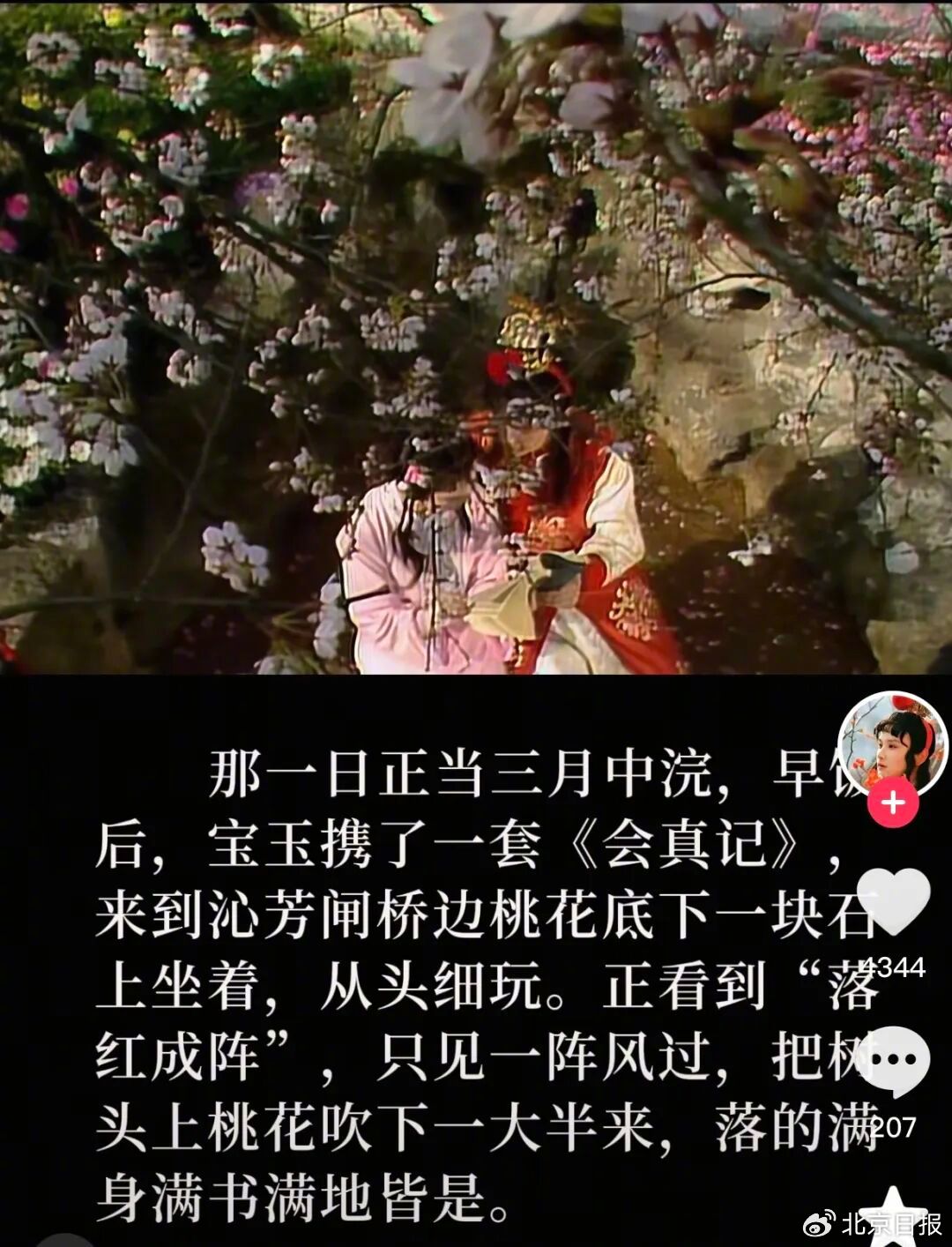 在欧阳奋强心中,宝黛两人一起在桃花树下偷看《西厢记》的画面是他最喜欢的段落之一,也是两人心有灵犀一点通的证明。“宝玉和黛玉就是在那个上午,完成了最珍贵的确认,因为他们三观相配,心灵相通,认知的世界,也是完全统一的。”