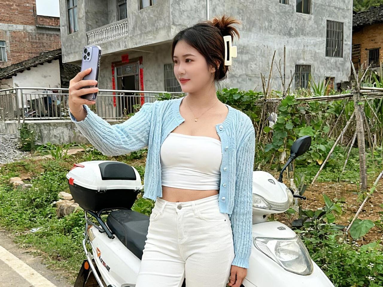 戚氏·村道偶见 作者Ⅰ朱珠 晓晴初。村蹊风软拂裙裾。 畦上蔬青,墙边藤绿,绕阶除。 村庐。瓦疏疏。灰墙楼倚砖垣居。 白鞍电驴停处,佳人独立态如酥。 蓝缕开衫,白绫束腰,裤裁喇叭舒徐。 看簪簪白夹,云鬟半挽,梢畔轻梳。 偶尔举袖自拍,屏光闪处,笑靥浅盈朱。 垂眸后、身依车座,指触屏隅。 意慵慵。漫数讯息,眉微蹙,又复展眉弧。 一时风静,墟烟轻袅,只听鸡犬相呼。 念城中尘事,蝇营狗苟,扰扰难如。 幸有乡郊一角,暂相离、心与白云俱。 羡伊自在神情,不沾俗累,眸底春波濡。 算人间、清趣皆如此,凭一刹、忘却荣枯。 向篱边、闲看青蔬。 待行时、犹记蓝衫裾。 晚风催步,残阳满径,归兴徐徐。