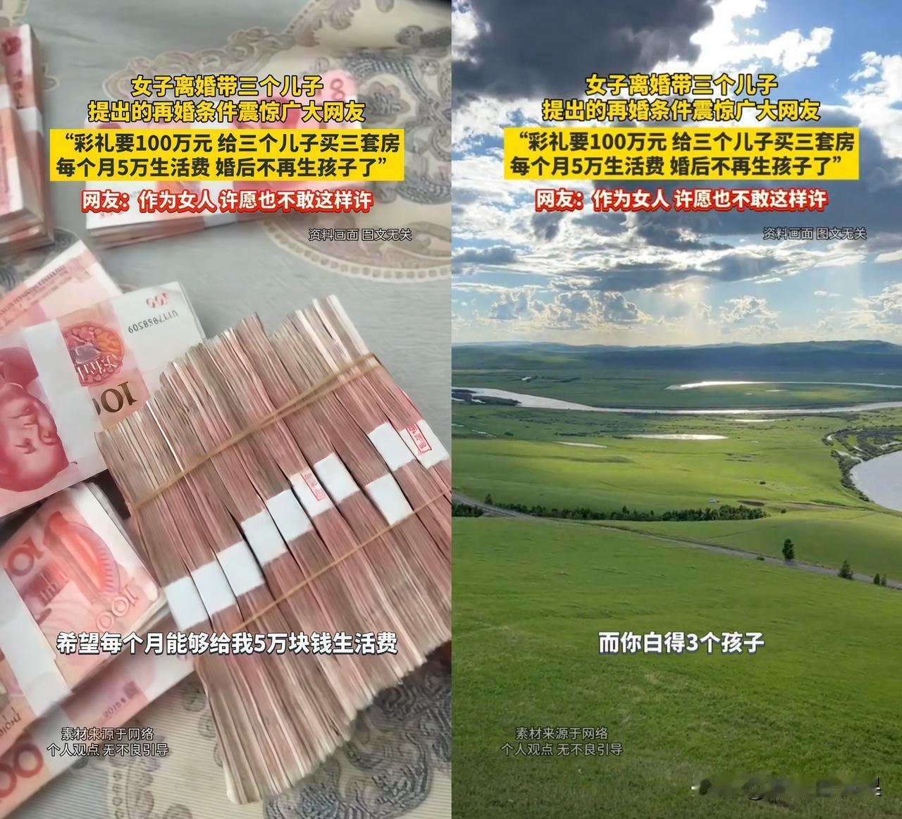 宝子们,我真的被这个新闻惊到下巴都要掉了! 一位离婚后带着三个儿子的女子,公开了自己的再婚条件:彩礼要100万,得给三个儿子各买一套房,每月还要5万生活费,而且婚后不再生孩子因为不想身材继续走样!她还说觉得她的要求不高,而且你还能白得三个儿子。 我看到的时候直接懵了,我做梦都不敢这么做,她是怎么好意思提这些条件的? 有网友也调侃说“作为女人许愿也不敢这样许”,这要求真的太苛刻了吧? 家人们,你们觉得这女子的再婚条件怎么样?评论区聊聊你的看法!