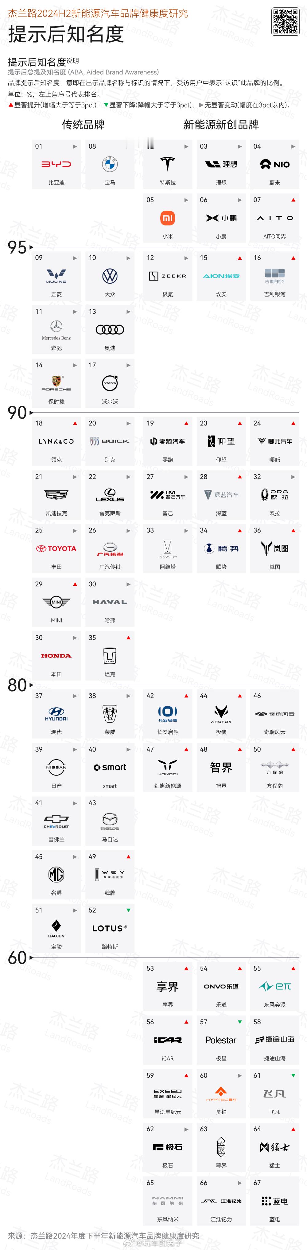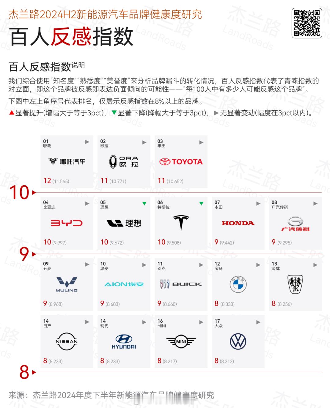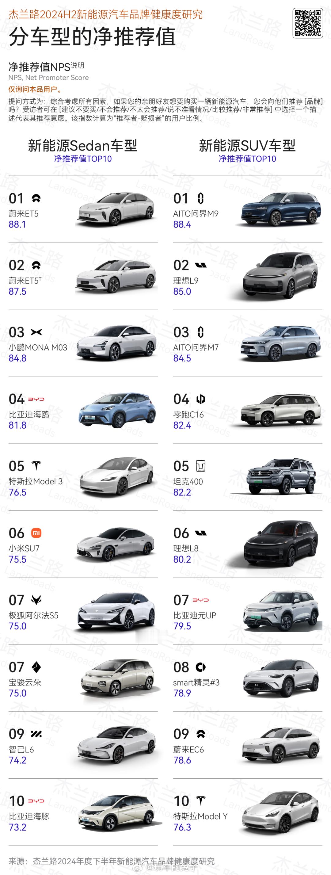 在新能源渗透率突破50%的今天,很多人的第一反应,也许是新能源车赢麻了。但是,我看完杰兰路这份报告,我反而觉得,现在的新能源车市场,已经从拼产品正式进入拼品牌体质的阶段。纵观整份报告,我觉得有几个关键点。首先,比亚迪赢在规模,理想赢在心智,小米和问界赢在话题与信任迁移。直到今天为止,比亚迪依然是很多人买新能源车时的第一反应,但它的问题也很清晰,用户是买它,不一定爱它。理想则刚好相反,家庭、舒适、稳重这套标签,已经牢牢焊死在品牌上,哪怕产品不再那么卷,但心智优势依然存在,这也是理想的优势之一。小米和问界更有意思,它们本质上是把原有的品牌信任,直接平移到了汽车上,这是传统车企最羡慕、也最难复制的能力。其次,蔚来、极氪的下滑,并不是产品突然不行,而是预期管理失败。在杰兰路的这份报告里,蔚来和极氪的问题几乎都指向同一个点,就是用户不知道你下一步要干什么,也不知道自己现在买的会不会很快被背刺。而在新能源车这种高更新频率的市场里,稳定预期本身就是一种高级产品力。再者,就是价格战开始变聪明了。就比如报告里的NPS回升,不是因为大家突然更满意,而是车企终于意识到,直接降价伤的是老用户,用金融方案、补贴兜底,才能既卖车又不拆口碑。所以,特斯拉、理想的这轮回暖,本质都是不去折腾用户。最后,也是最残酷的一点,很多品牌已经被挤出消费者的认知了。我不是说他们的车不好,而是对于想买车的人来说,根本想不起来这些车。特别是在品牌数量远超用户认知上限的当下,假如一台车甚至一个品牌,无法进入消费者的购车名单,除非哪天出个爆款,唤醒一下大家的记忆,否则就约等于慢性死亡。说到底,用一句话总结这份报告,就是在新能源车竞争愈发激烈的下半场,现在比的已经不是谁更会造车,而是谁更懂如何获取大家的长期信任。毕竟,产品只是门票,品牌才是护城河。新能源汽车新能源大牛说杰兰路我与汽车的日常大v聊车