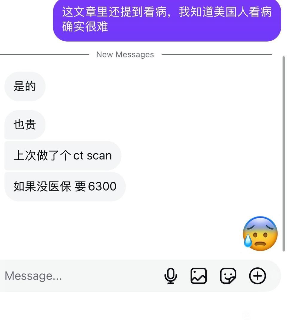朋友在美国,仅仅做个CT,不交医保的话就需要6300美元.. 这还是一般的私立医院,如果选公立的就慢慢排几个月吧... 目前已经正式移民,他还提到每个月需要花300美金为自己缴纳医疗保险,直接从工资里扣,看病非常难,医疗费用极其... 还有老生常谈的加班问题:他说加班并没有加班费,大家默契的留在公司工作更长的时间,虽然表面不提“加班”,但大家都在加班...