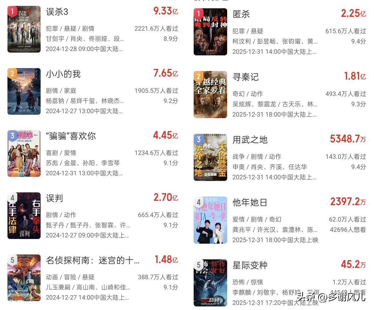 今年才可能是真正的影视寒冬,今年开局的跨年档的票房难敌去年的跨年档电影票房,且数额差值可能达十几亿之巨! 截止1月5号,今年跨年档的票房才4.8亿左右。当前本次跨年档的票房最高电影是《匿杀》的2.25亿,其次是《寻秦记》的1.81亿,而这二者的实时预测总票房也不过才3亿左右的体量。二者之后的《用武之地》当前票房才堪堪5348万,更是难堪大任。 去年的跨年档票房是26.04亿,最高的是《误杀3》的9.33亿,其次是《小小的我》7.65亿,第三是《骗骗喜欢你》的4.55亿。 数据对比看来,今年跨年档的电影总票房相较于去年,估计将减少10几亿的体量,对2026年来而言,这种票房开门之势是非常惨淡的。去年的总票房之所以能达到500多亿,是因为有《哪吒之魔童闹海》的横空出世,扣除其150多亿的体量,去年总票房也就350多亿,而显然哪吒是个特例,不会年年有之。而从今年开始的跨年档票房来看,考验影视行业的时刻到了,今年才可能是真正的影视寒冬。