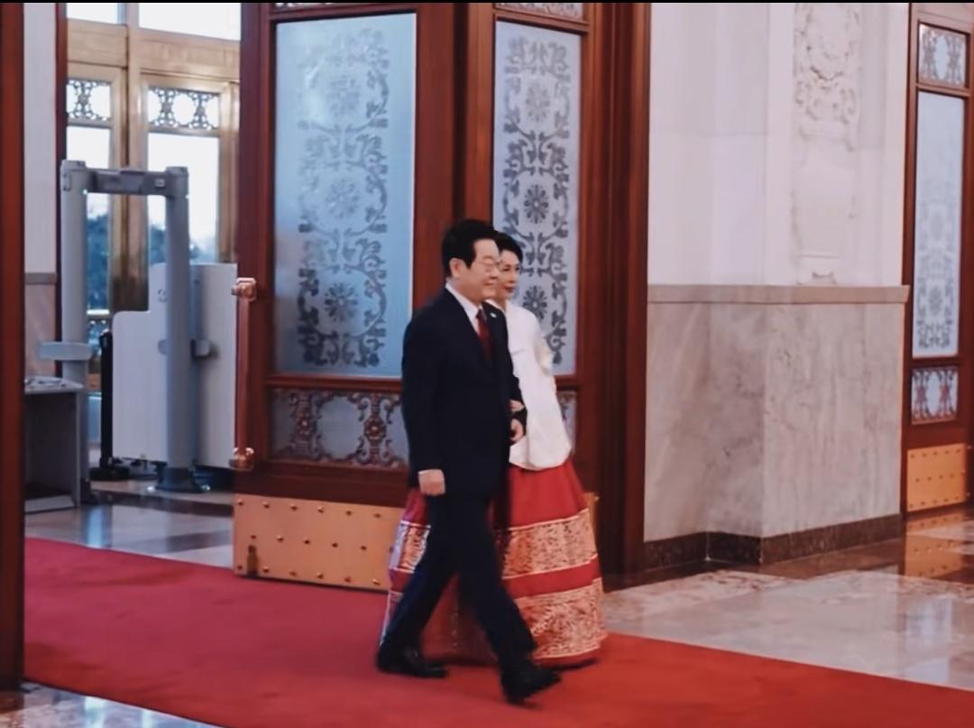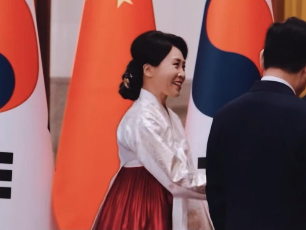 1月5日,金惠景与丈夫一同亮相人民大会堂红毯,金惠景身穿白色上衣与红色裙摆的传统韩服,戴着绿宝石戒指,头发梳成整洁的丸子头,发间插着一枚发簪,整体装扮典雅端庄。 值得注意的是,金惠景的双手始终收在韩服袖内未曾露出,这一细节遵循了韩国传统礼仪中女性手部不宜外显的习惯。 金惠景走上红毯时,轻轻挽着丈夫的手臂,步伐协调,姿态自然,握手时面露笑容,显得格外愉快,握手的动作也保持得平稳得体。 在合影环节,金惠景始终保持着含蓄挺拔的站姿,笑容温和,举止始终贴合传统礼仪,自然大方,很温婉。