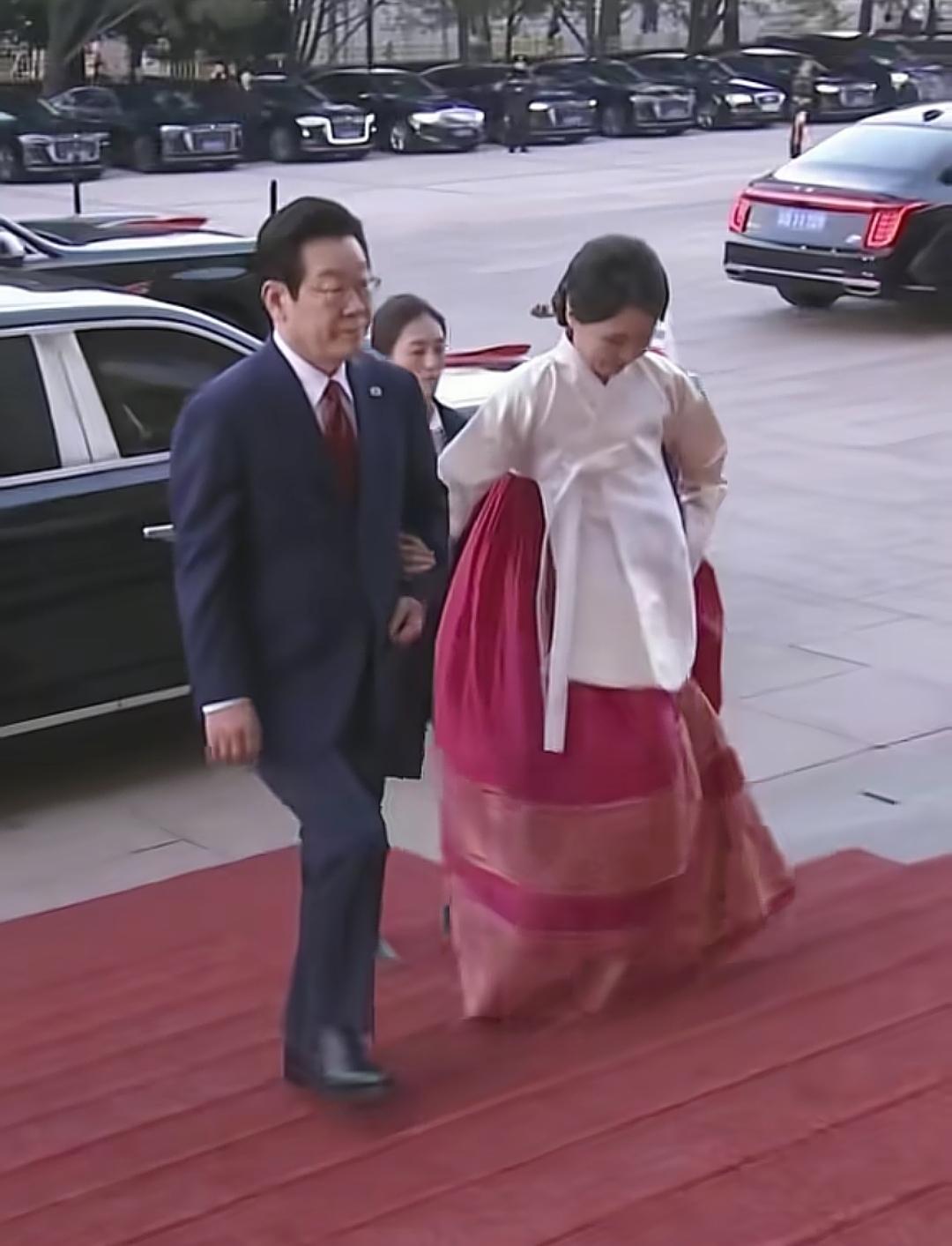 1月5日,金惠景女士到访人民大会堂时,选择了一身传统韩服亮相,红裙白上衣的搭配端庄醒目,双手收拢在衣裙中,脚穿白色鞋子,整体显得含蓄典雅。 金惠景这次来华特别注重礼仪,这次穿韩服正式着装,表现出她重视仪态,很内敛,并且还不露手臂与手部,说明很讲究,走上铺着红地毯的台阶时,金惠景步履平稳,与场合气氛很契合。 金惠景身后跟着一位穿正装的女保镖,步伐保持适当距离,目光专注四周,因为是在重要场合,金惠景这次来华随行保镖衣着正式、举止克制,显得专业且尊重。