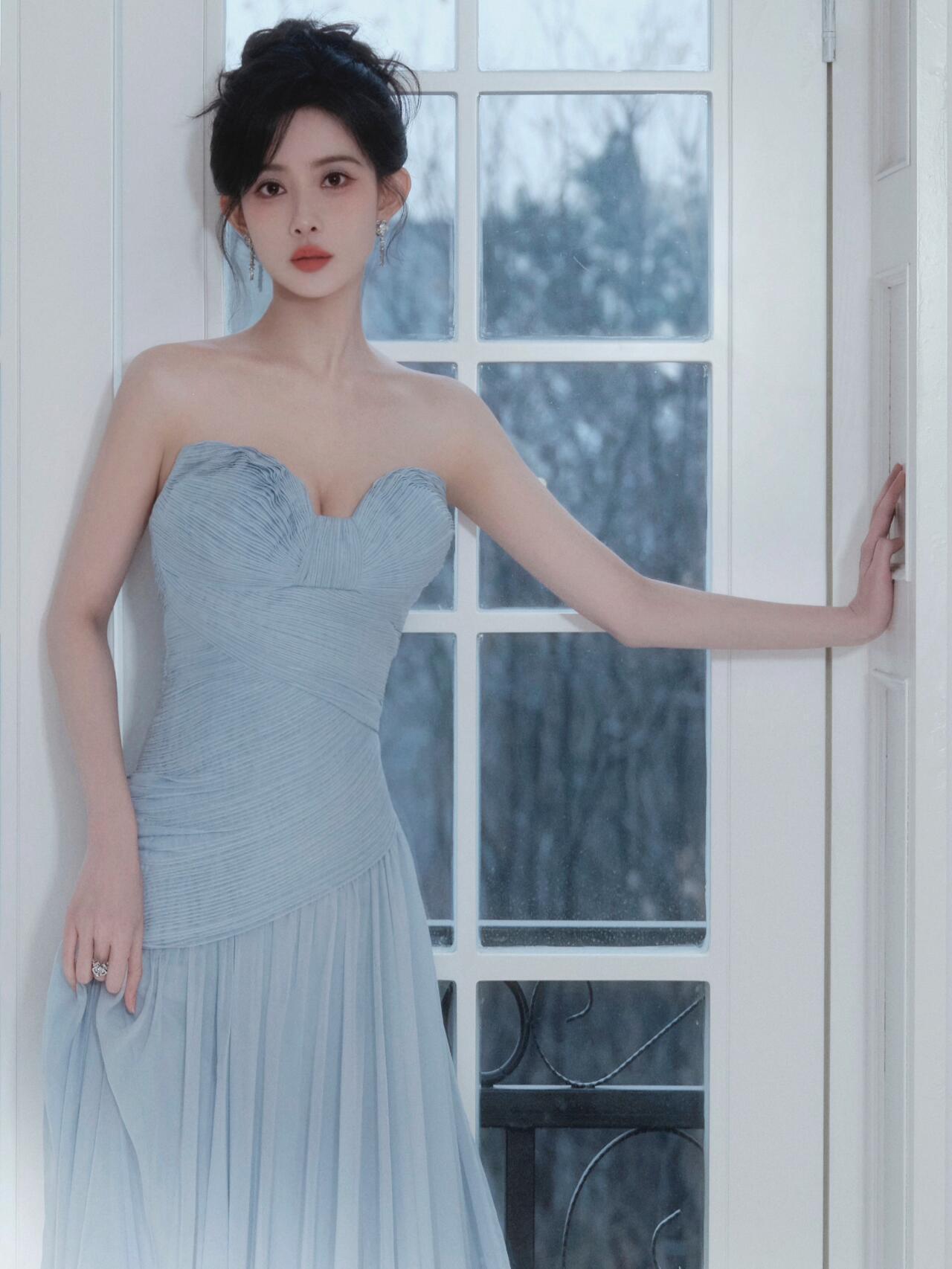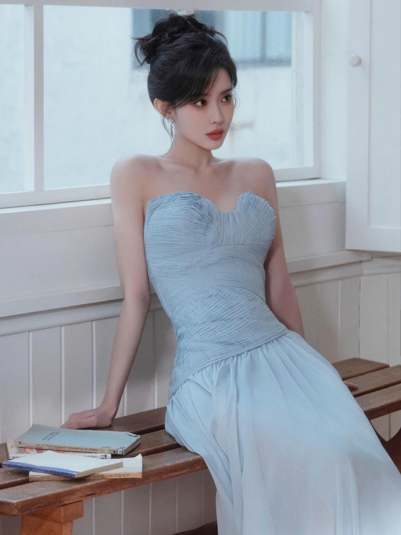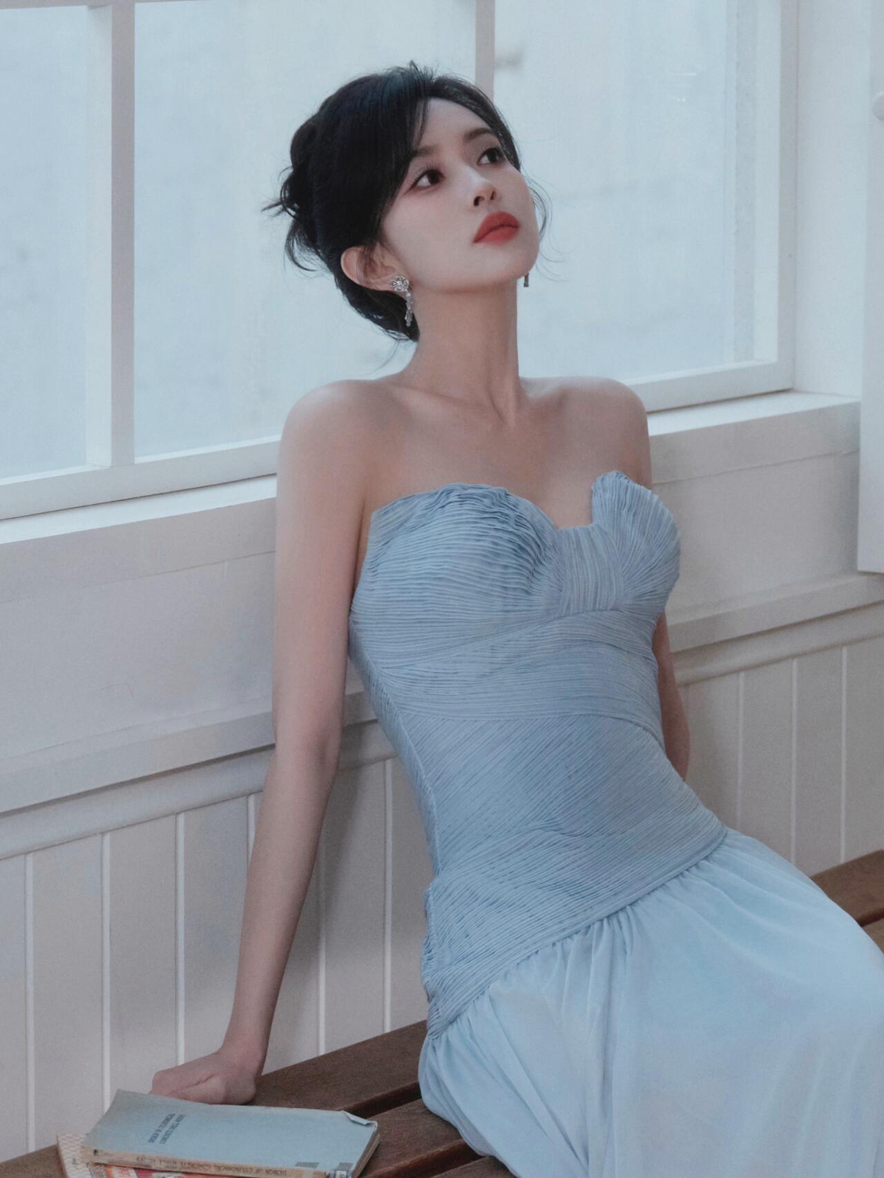 肤白貌美!孟子义穿蓝色抹胸裙,太好看了孟子义