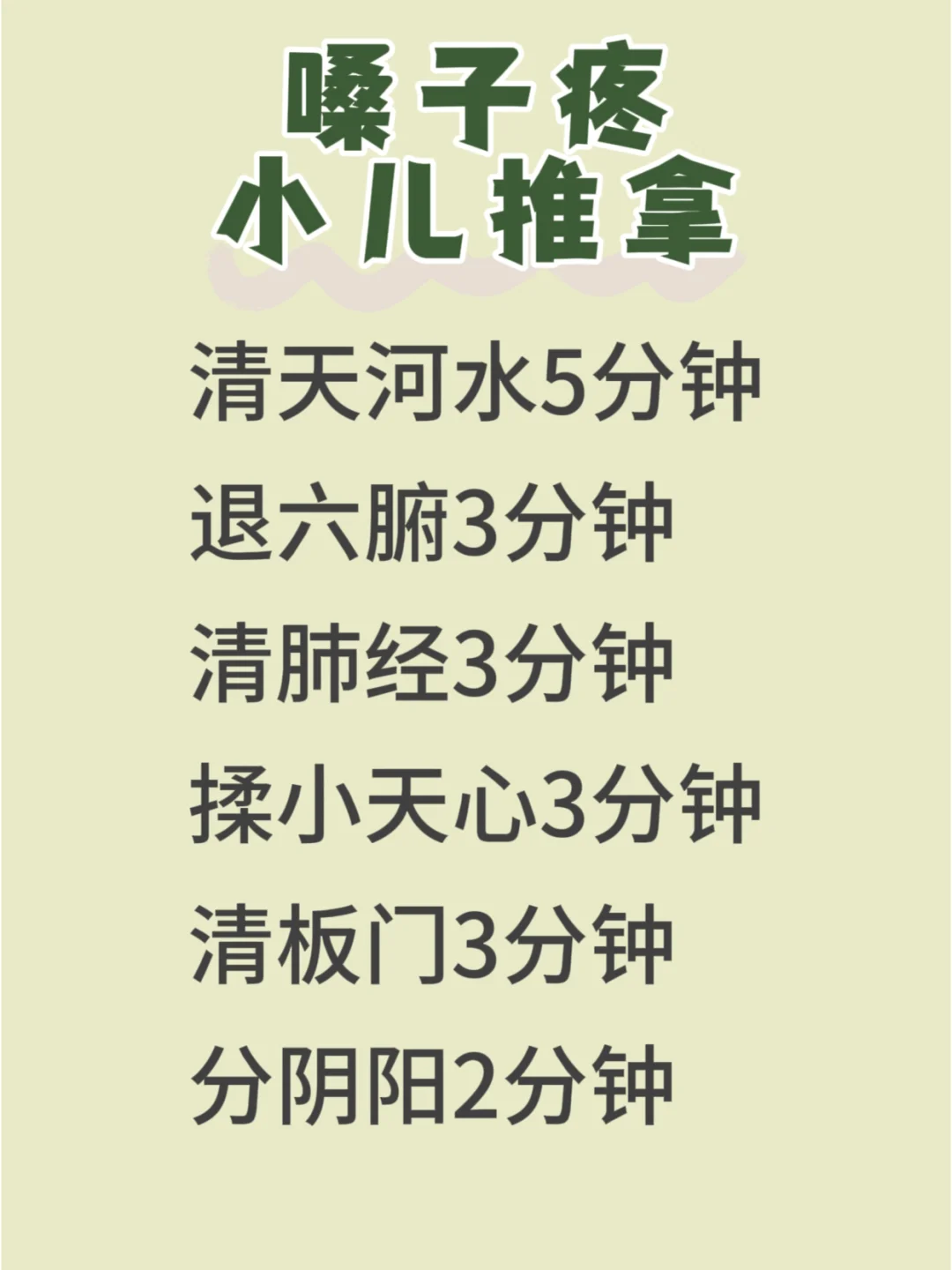 [清单R]小儿推拿:清天河水5分钟,退六腑3分钟,清肺经3分钟,揉小天心3分钟,清板门3分钟,分阴阳2分钟。