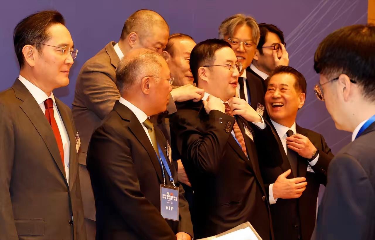 1月5日,韩国总统李在明在北京参加中韩商务论坛,韩国四大财阀三星电子会长李在镕、SK集团会长崔泰源、现代汽车集团会长郑义宣、LG集团会长具光谟都作为随行人员一同出席。在拍合影时,一行人先排好队等待,LS控股会长具滋恩为站在前排的LG集团会长具光谟整理衣领。这一幕让站在身边的人员们都纷纷哈哈大笑,不过吃瓜的现代汽车集团会长郑义宣和三星电子会长李在镕却全程显得云淡风轻。李在明与李在镕微笑着打招呼