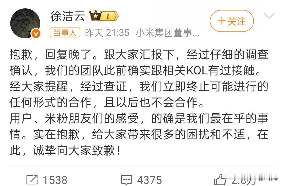 小米公关部经理徐洁云发文向用户和米粉致歉。 据5日网上热搜消息,小米4日因向万能的大熊投流被发觉,在5日下午在科技界掀起了轩然大波,众多米系支持者发文对小米此举纷纷表达严重不满,事件问题一下子被顶上热搜。 就在事态越演越烈,影响进一步扩大时,徐洁云不得不出来发文澄清并回答米系支持者关切的问题。徐洁云在文中明确告知已经终止与万能的大熊相关合作。至此,事态才得以平息。 不得不说,这波投流的操作,简直就是西贝级公关,自个儿给自己挖了坑,怪不得引起那么大的舆论反响