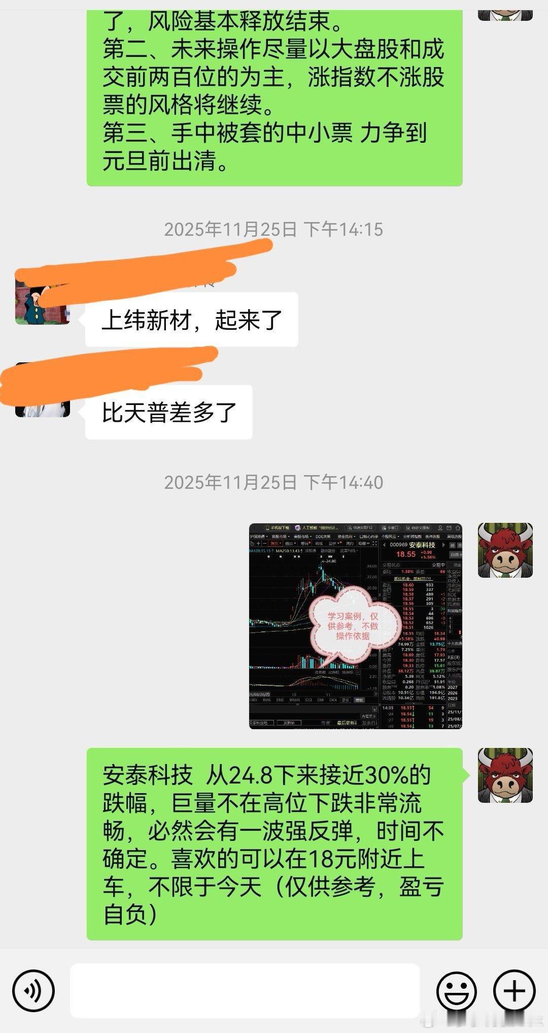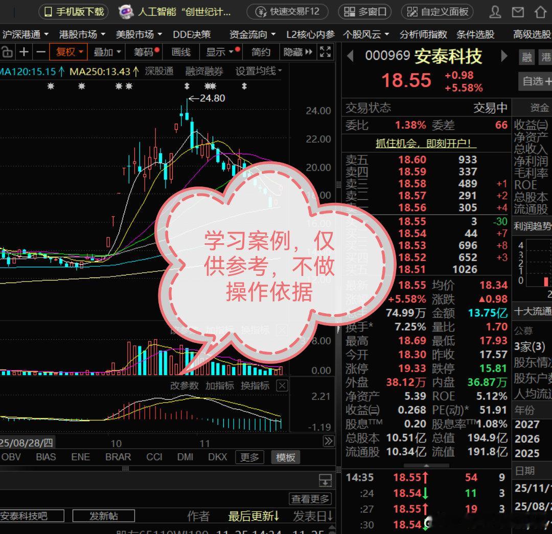 安泰科技,我这次拒绝坐电梯了安泰科技,是我们在11月25日开始建议大家上车的,理由就是下跌的过程非常的丝滑,11月21日大跌之后,突然出现了连续两天的高开高走,这就是反常的迹象。安泰科技,上次冲高回落没走坐了个电梯,这次又来到前期高点附近,又是玩冲高回落的把戏。今天的冲高回落,其实比12月15日的那天量能要小,但是考虑到大盘逼空已久,而且今天出现了加速的走势,我这次选择了下车锁定利润了。不排除,这个上影线是骗我下车的,但我也愿意被骗,因为我没那个能力,从头吃到尾,能力有限。欢迎加入我们的免费交流群财经股票