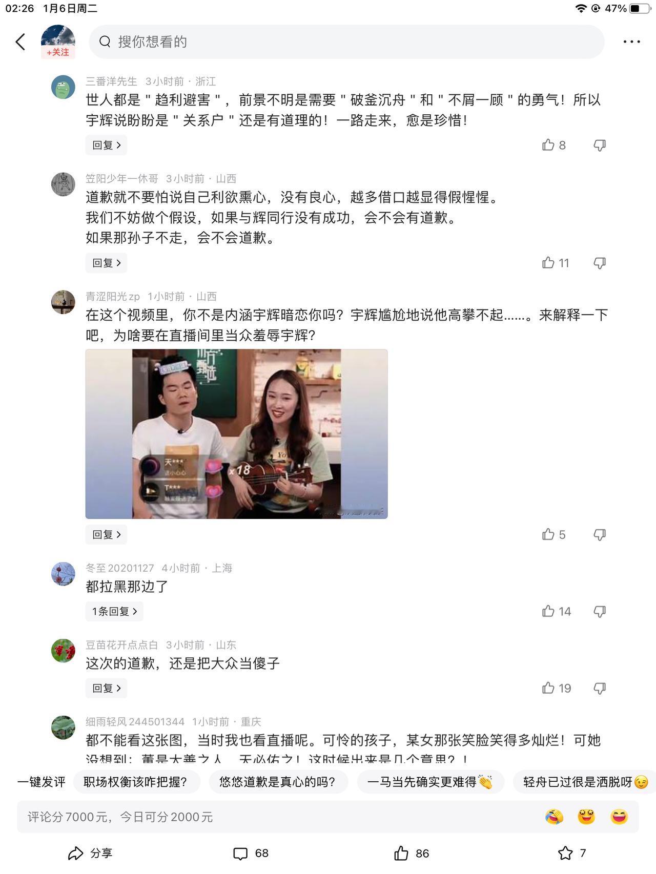 悠悠出来道歉,用自己的账号。你叔离开了,你就这么大胆的道歉几个意思。你也不想留了吗?你把谁当傻子呢?但凡你当初能给宇辉一点情绪上的支持。那些傻丈母娘也会去让你不输。即使你不离开。即使你仍然挺你叔儿。 时过境迁了,你再提就没意思了。曾经,有一份破天的富贵,摆在她眼前,可她没有珍惜。你当时的声望,比潇潇强多了,但凡你当时动点恻隐之心,你现在都不是这个样子。 不必要道歉,这流量蹭的,哗哗的。 怎么,想利用个人Ip做点事情了?无非是赚钱呗。无非是当时觉得那个人是昙花一现罢了!谁知道那朵昙花,一开就开了两年,还在盛放当中。所以才有了道歉,属实有点没劲了。