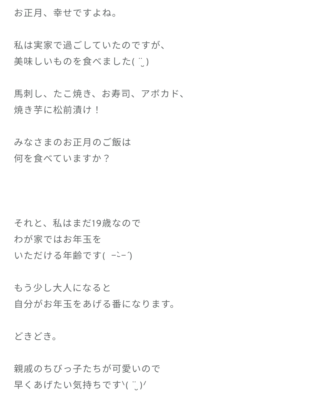 佐藤優羽「新年、明けましておめでとうございます。2026年になりましたね。みなさま、お正月はいかがお過ごしでしょうか?私は馬刺しを食べ、たこ焼きを食べ、お寿司を食べ…。美味しいお正月でした。お正月といえば、これがありますね。そうです、箱根駅伝です。今年も圧倒されるようなシーンがたくさんあって、とっても面白かったですᐠ( ¨̮ )ᐟ」